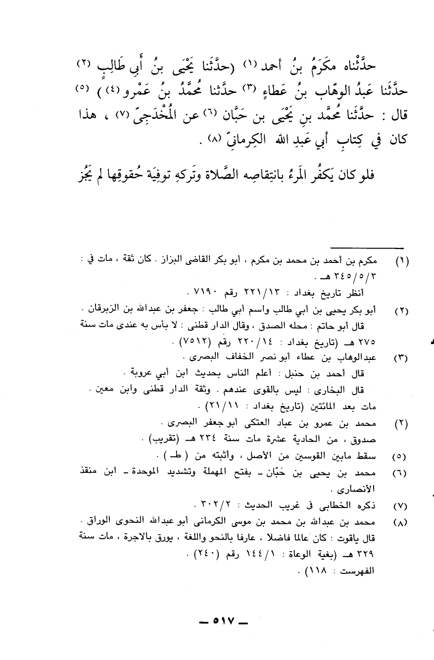 حدثناه مكرم بن أحمد (حدثنا يحيى بن أبي طالب حدثنا عبد الوهاب بن عطاء حدثنا محمد بن عمرو) قال: حدثنا محمد بن يحيى بن حبان عن المخدجي، هذا كان في كتاب أبي عبد الله الكرماني.