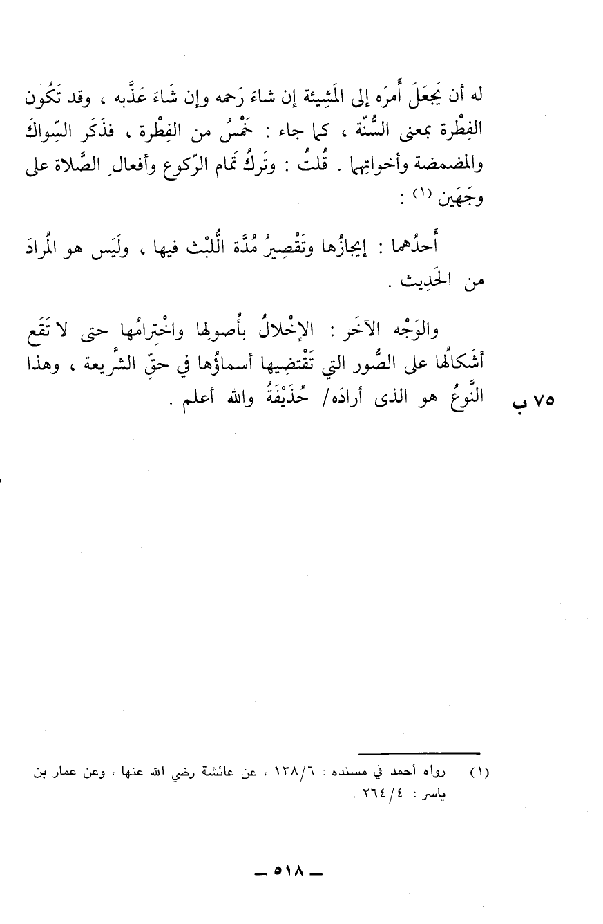 له أن يجعل أمره إلى المشيئة إن شاء رحمه وإن شاء عذبه، وقد تكون الفطرة بمعنى السنة، كما جاء: خمس من الفطرة، فذكر السواك والمضمضة وأخواتهما. قلت: وترك تمام الركوع وأفعال الصلاة على وجهين:
