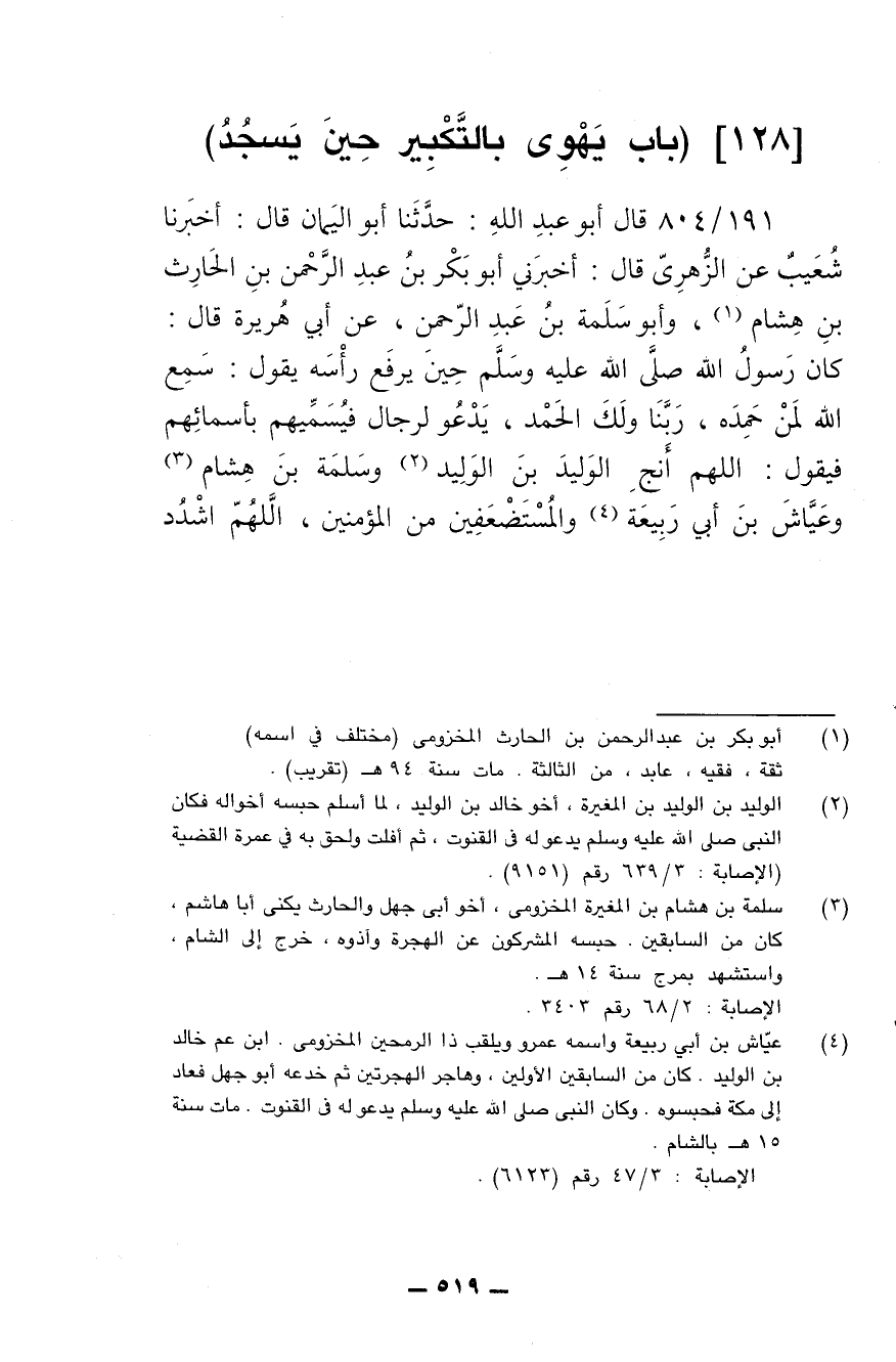 191/ 804 - قال أبو عبد الله: حدثنا أبو اليمان قال: أخبرنا شعيب عن الزهري قال: أخبرني أبو بكر بن عبد الرحمن بن الحارث بن هشام، وأبو سلمة بن عبد الرحمن، عن أبي هريرة قال: كان رسول الله صلى الله عليه وسلم حين يرفع رأسه يقول: سمع الله لمن حمده، ربنا ولك الحمد، يدعو لرجال فيسميهم بأسمائهم فيقول: اللهم أنج الوليد بن الوليد وسلمة بن هشام وعياش بن أبي ربيعة والمستضعفين من المؤمنين، اللهم اشدد