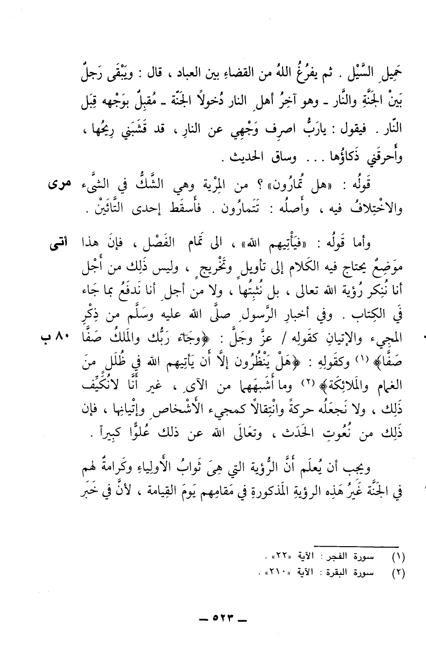 وأما قوله: (فيأتيهم الله) إلى تمام الفصل، فإن هذا موضع يحتاج فيه الكلام إلى تأويل وتخريج، وليس ذلك من أجل أننا ننكر رؤية الله تعالى، بل نثبتها، ولا من أجل أنا ندفع بما جاء في الكتاب وفي أخبار الرسول صلى الله عليه وسلم من ذكر المجيء والإتيان كقوله عز وجل: {وجاء ربك والملائكة صفا صفا} وكقوله: {هل ينظرون إلا أن يأتيهم الله في ظلل من الغمام والملائكة) وما أشبههما من الآي، غير أنا لا نكيف ذلك، ولا نجعله حركة وانتقالا كمجيء الأشخاص وإتيانها، فإن ذلك من نعوت الحدث، وتعالى الله عن ذلك علوا كبيرا.
