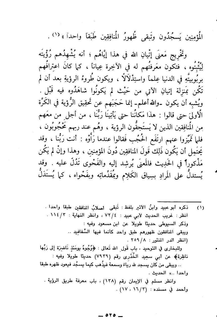 ويشبه أن يكون -والله أعلم- إنما حجبهم عن تحقيق الرؤية في الكَرَّة الأولى حتى قالوا: هذا مكاننا حتى يأتينا ربنا، من أجل من معهم من المنافقين الذين لا يستحقون الرؤيةن وهم عند ربهم محجوبون، فلما تميزوا عنهم ارتفع الحجب فقالوا عندما رأوه: أنت ربنا، وقد يحتمل أن يكون ذلك قول المنافقين دون المؤمنين، وهذا وإن لم يكن مذكورا في الحديث فالمعنى يرشد إليه والفحوى تدل عليه. وقد يستدل على المراد بسياق الكلام وبمقدماته وبفحواه، كما يستدل