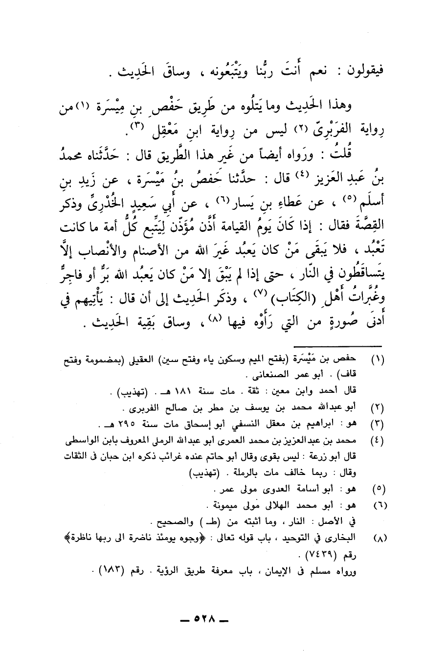 قلت: ورواه أيضا من غير هذا الطريق قال: حدثناه محمد بن عبد العزيز قال: حدثنا حفص بن ميسرة، عن زيد بن أسلم، عن عطاء بن يسار، عن أبي سعيد الخدري وذكر القصة فقال: إذا كان يوم القيامة أذن مؤذن ليتبع كل أمة ما كانت تعبد، فلا يبقى من كان يعبد غير الله من الأصنام والأنصاب إلا يتساقطون في النار، حتى إذا لم يبق إلا من كان يعبد الله بر أو فاجر وغُبَّرات أهل (الكتاب)، وذكر الحديث إلى أن قال: يأتيهم في أدنى صورة من التي رأوه فيها، وساق بقية الحديث.