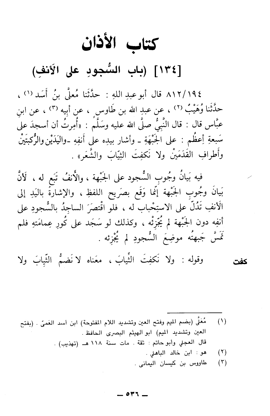 194/ 812 - قال أبو عبد الله: حدثنا معلى بن أسد، حدثنا وهيب، عن عبد الله بن طاوس، عن أبيه، عن ابن عباس قال: قال النبي صلى الله عليه وسلم: (أمرت أن أسجد على سبعة أعظم: على الجبهة -وأشار بيده على أنفه- واليدين والركبتين وأطراف القدمين، ولا نكفت الثياب والشعر).