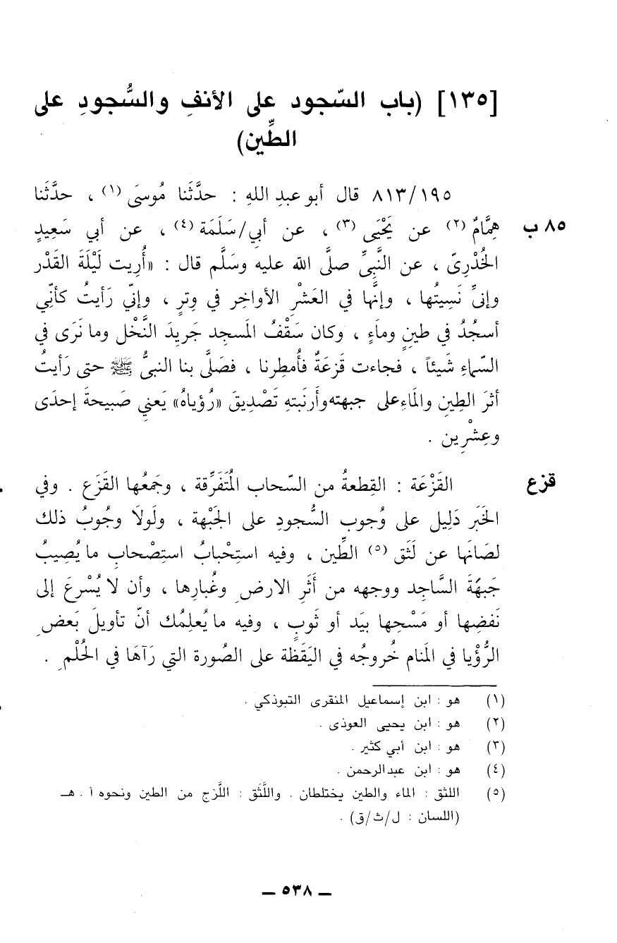 195/ 813 - قال أبو عبد الله: حدثنا موسى، حدثنا همام عن يحيى عن أبي سلمة، عن أبي سعيد الخدري، عن النبي صلى الله عليه وسلم قال: (أريت ليلة القدر وإني نسيتها، وإنها في العشر الأواخر في وتر، وإني رأيت كأني أسجد في طين وماء، وكان سقف المسجد جريد النخل وما نرى في السماء شيئا، فجاءت قزعة فأُمطرنا، فصلى بنا النبي - صلى الله عليه وسلم - حتى رأيت أثر الطين والماء على جبهته وأرنبته تصديق رؤياه، يعني صبيحة إحدى وعشرين.