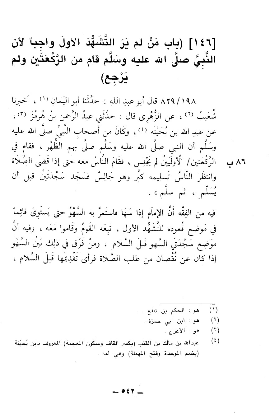 [146] (باب من لم ير التشهد الأول واجبا لأن النبي صلى الله عليه وسلم قام من الركعتين ولم يرجع)
