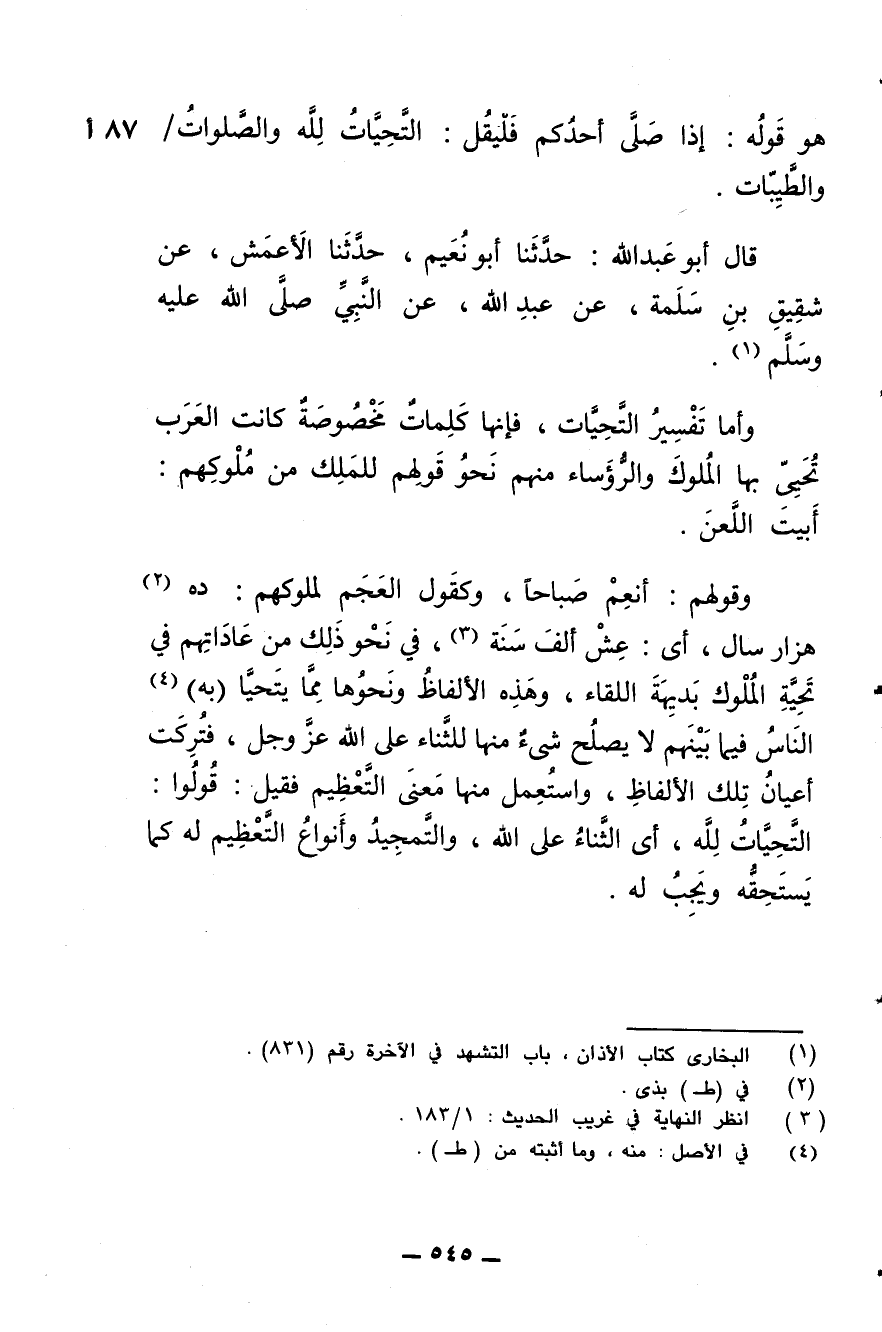 وأما تفسير التحيات، فإنها كلمات مخصوصة كانت العرب تحيي بها الملوك والرؤساء منهم نحو قولهم للملك من ملوكهم: أبيتَ اللعن.