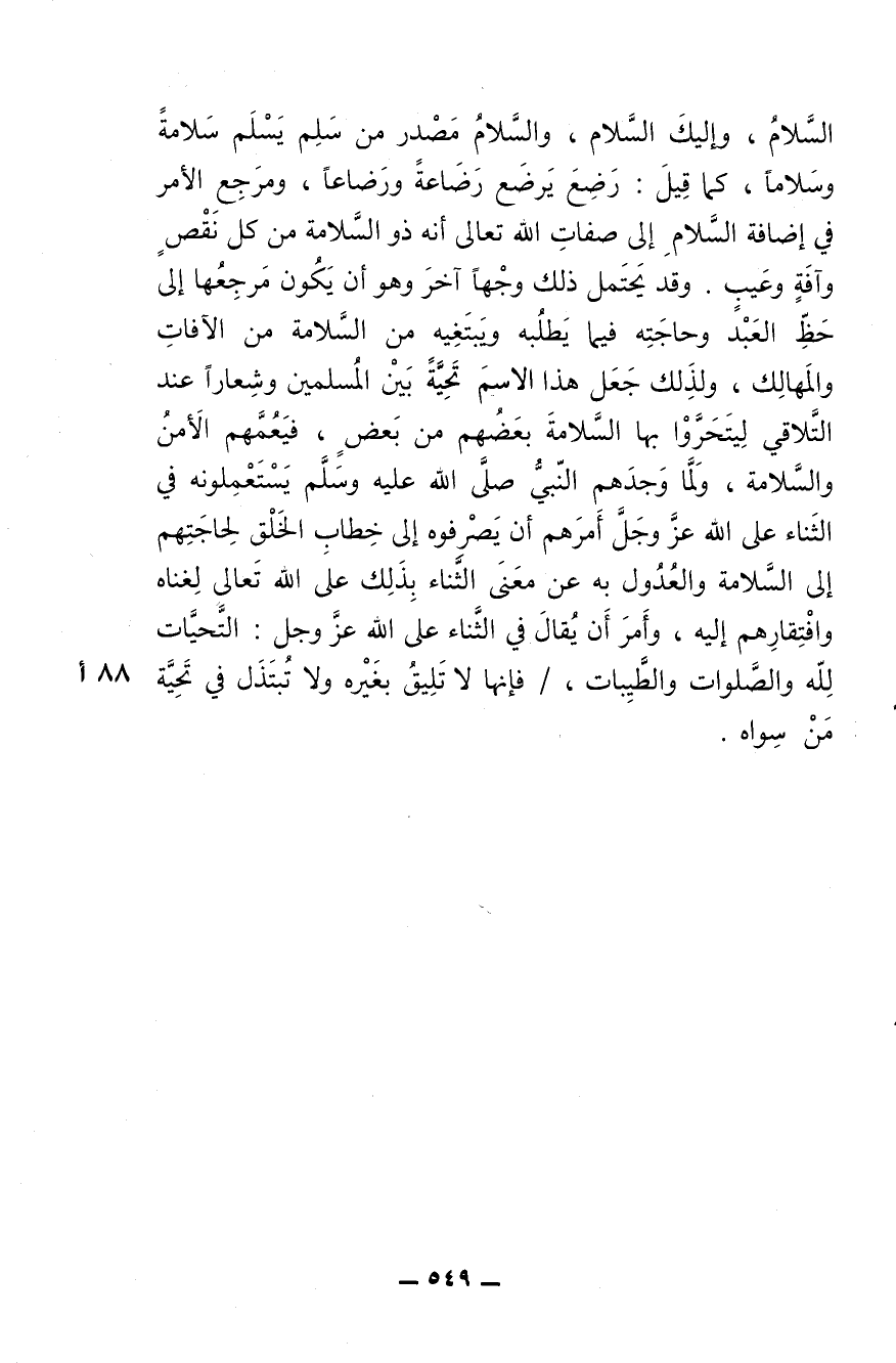 السلام، وإليك السلام، والسلام مصدر من سلم يسلم سلامة وسلاما، كما قيل: رضع يرضع رضاعة ورضاعا، ومرجع الأمر في إضافة السلام إلى صفات الله تعالى أنه ذو السلامة من كل نقص وآفة وعيب. وقد يحتمل ذلك وجها آخر وهو أن يكون مرجعها إلى حظ العبد وحاجته فيما يطلبه ويبتغيه من السلامة من الآفات والمهالك، ولذلك جعل هذا الاسم تحية بين المسلمين وشعارا عند التلاقي ليتحروا بها السلامة بعضهم من بعض، فيعمهم الأمن والسلامة، ولما وجدهم النبي صلى الله عليه وسلم يستعملونه في الثناء على الله عز وجل أمرهم أن يصرفوه إلى خطاب الخلق لحاجتهم إلى السلامة والعدول به عن معنى الثناء بذلك على الله تعالى لغناه وافتقارهم إليه، وأمر أن يقال في الثناء على الله عز وجل: التحيات لله والصلوات والطيبات، فإنها لا تليق بغيره ولا تبتذل في تحية من سواه.