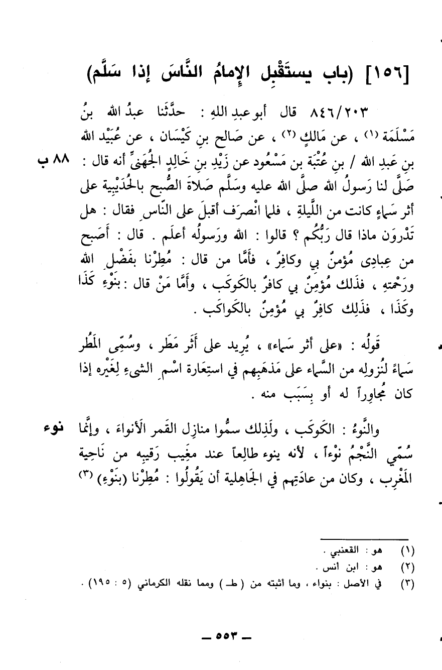 203/ 846 - قال أبو عبد الله: حدثنا عبد الله بن مسلمة، عن مالك، عن صالح بن كيسان، عن عبيد الله بن عبد الله بن عتبة بن مسعود عن زيد بن خالد الجهني أنه قال: صلى لنا رسول الله صلى الله عليه وسلم صلاة الصبح بالحديبية على أثر سماء كانت من الليلة، فلما انصرف أقبل على الناس فقال: هل تدرون ماذا قال ربكم؟ قالوا: الله ورسوله أعلم. قال: أصبح من عبادي مؤمن بي وكافر، فأما من قال: مطرنا بفضل الله ورحمته، فذلك مؤمن بي كافر بالكوكب، وأما من قال: بنوء كذا وكذا، فذلك كافر بي مؤمن بالكوكب.