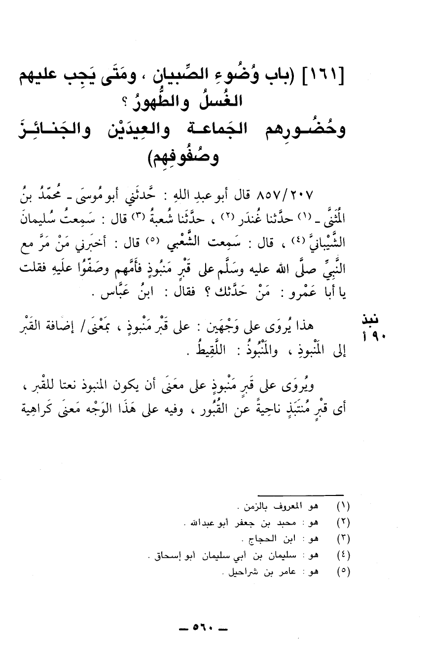 207/ 857 - قال أبو عبد الله: حدثني أبو موسى -محمد بن المثنى- حدثنا غندر، حدثنا شعبة قال: سمعت سليمان الشيباني، قال: سمعت الشعبي قال: أخبرني من مر مع النبي صلى الله عليه وسلم على قبر منبوذ فأمهم وصفوا عليه فقلت يا أبا عمرو: من حدثك؟ فقال: ابن عباس.