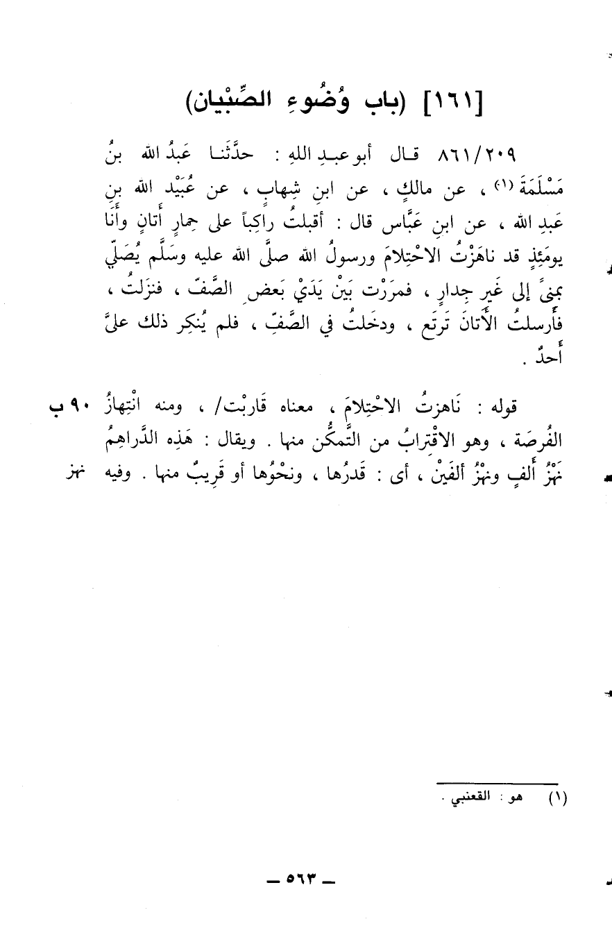 209/ 861 - قال أبو عبد الله: حدثنا عبد الله بن مسلمة، عن مالك، عن ابن شهاب، عن عبيد الله بن عبد الله، عن ابن عباس قال: أقبلت راكبا على حمار أتان، وأنا يومئذ قد ناهزتُ الاحتلام ورسول الله صلى الله عليه وسلم يصلي بمنى إلى غير جدار، فمررت بين يد بعض الصف، فنزلت، فأرسلت الأتان ترتع، ودخلت في الصف، فلم ينكر ذلك عليَّ أحد.
