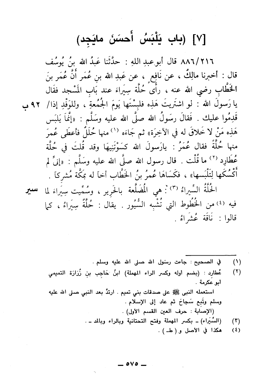 216/ 886 - قال أبو عبد الله: حدثنا عبد الله بن يوسف، قال: أخبرنا مالك، عن نافع، عن عبد الله بن عمر أن عمر بن الخطاب رضي الله عنه، رأى حلة سيراء عند باب المسجد فقال: يا رسول الله، لو اشتريت هذه فلبستها يوم الجمعة، وللوفد إذا قدموا عليك. فقال رسول الله صلى الله عليه وسلم: (إنما يلبس هذه من لا خلاق له في الآخرة) ثم جاءه منها حلل فأعطى عمر منها حلة فقال عمر: يا رسول الله كسوتنيها وقد قلت في حلة عطارد ما قلت. قال رسول الله صلى الله عليه وسلم: (إني لم أكسكها لتلبسها) فكساها عمر بن الخطاب أخا له بمكة مشركا.