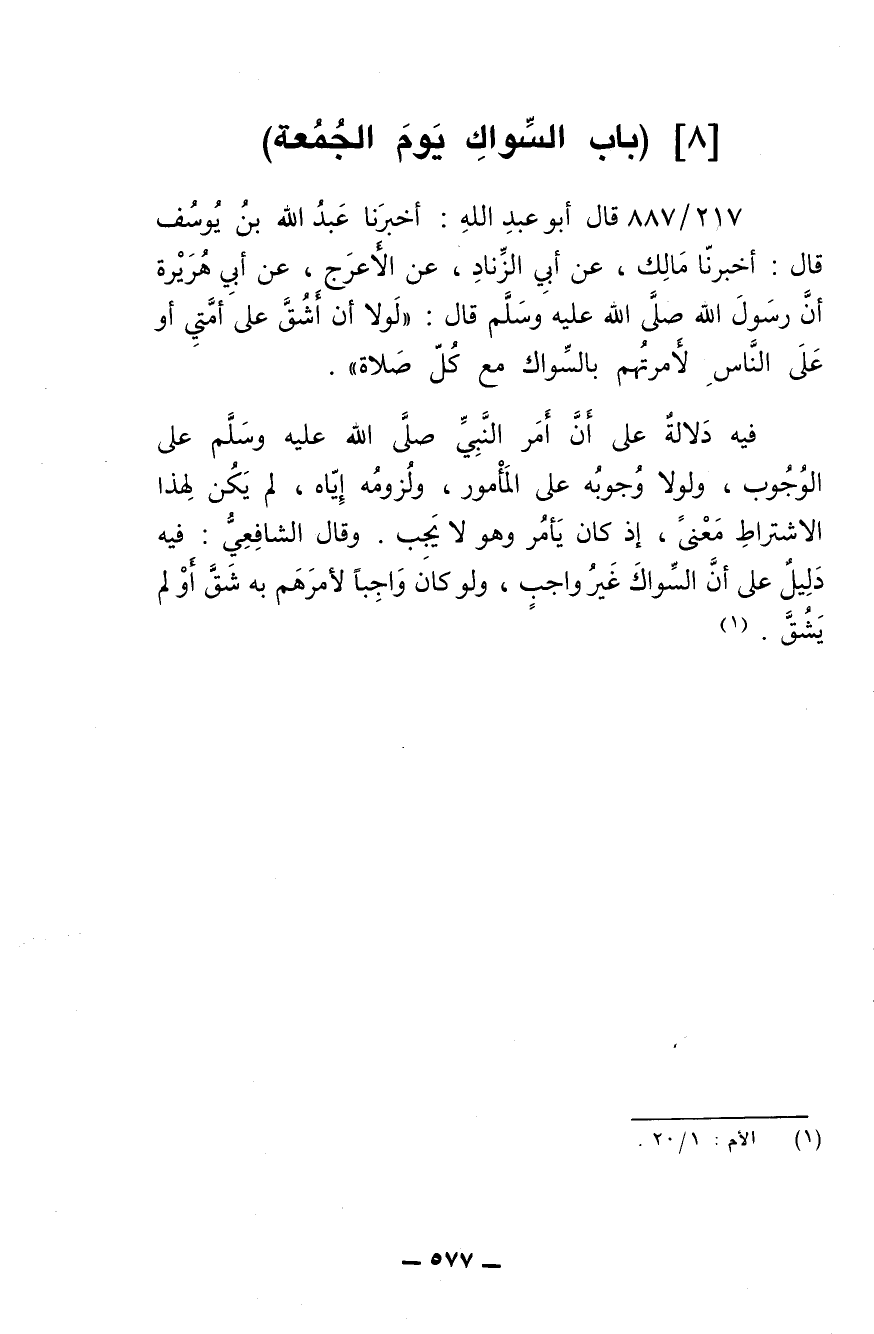 217/ 887 - قال أبو عبد الله: أخبرنا عبد الله بن يوسف قال: أخبرنا مالك، عن أبي الزناد، عن الأعرج، عن أبي هريرة أن رسول الله صلى الله عليه وسلم قال: (لولا أن أشق على أمتي أو على الناس لأمرتهم بالسواك مع كل صلاة).
