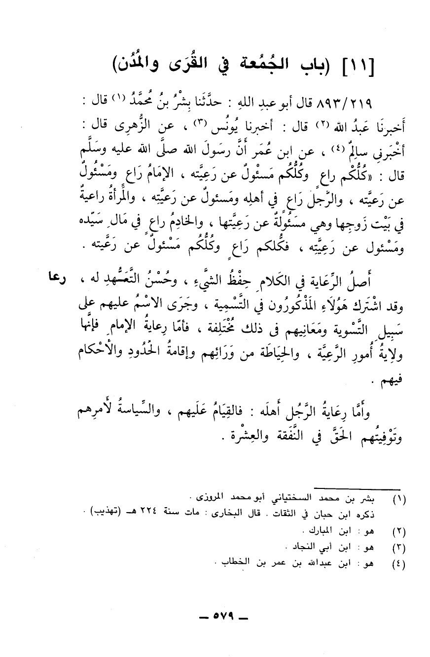 219/ 893 - قال أبو عبد الله: حدثنا بشر بن محمد قال: أخبرنا عبد الله قال: أخبرنا يونس، عن الزهري قال: أخبرني سالم، عن ابن عمر أن رسول الله صلى الله عليه وسلم قال: (كلكم راع وكلكم مسئول عن رعيته، والمرأة راعية في بيت زوجها ومسئولة عن رعيتها، والخادم راع في مال سيده ومسئول عن رعيته، فكلكم راع وكلكم مسئول عن رعيته).