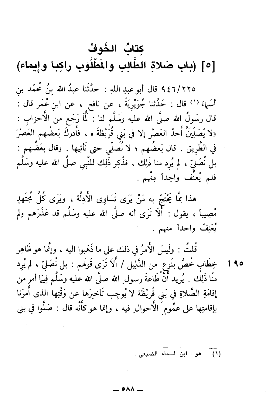 225/ 946 - قال أبو عبد الله: حدثنا عبد الله بن محمد بن أسماء قال: حدثنا جويرية، عن نافع، عن ابن عمر قال: قال رسول الله صلى الله عليه وسلم لنا لما رجع من الأحزاب: (لا يصلين أحد العصر إلا في بني قريظة)، فأدرك بعضهم العصر في الطريق، قال بعضهم: لا نصلي حتى نأتيها. وقال بعضهم: بل نصلي، لم يرد منا ذلك، فذكر ذلك للنبي صلى الله عليه وسلم، فلم يعنف واحدا منهم.