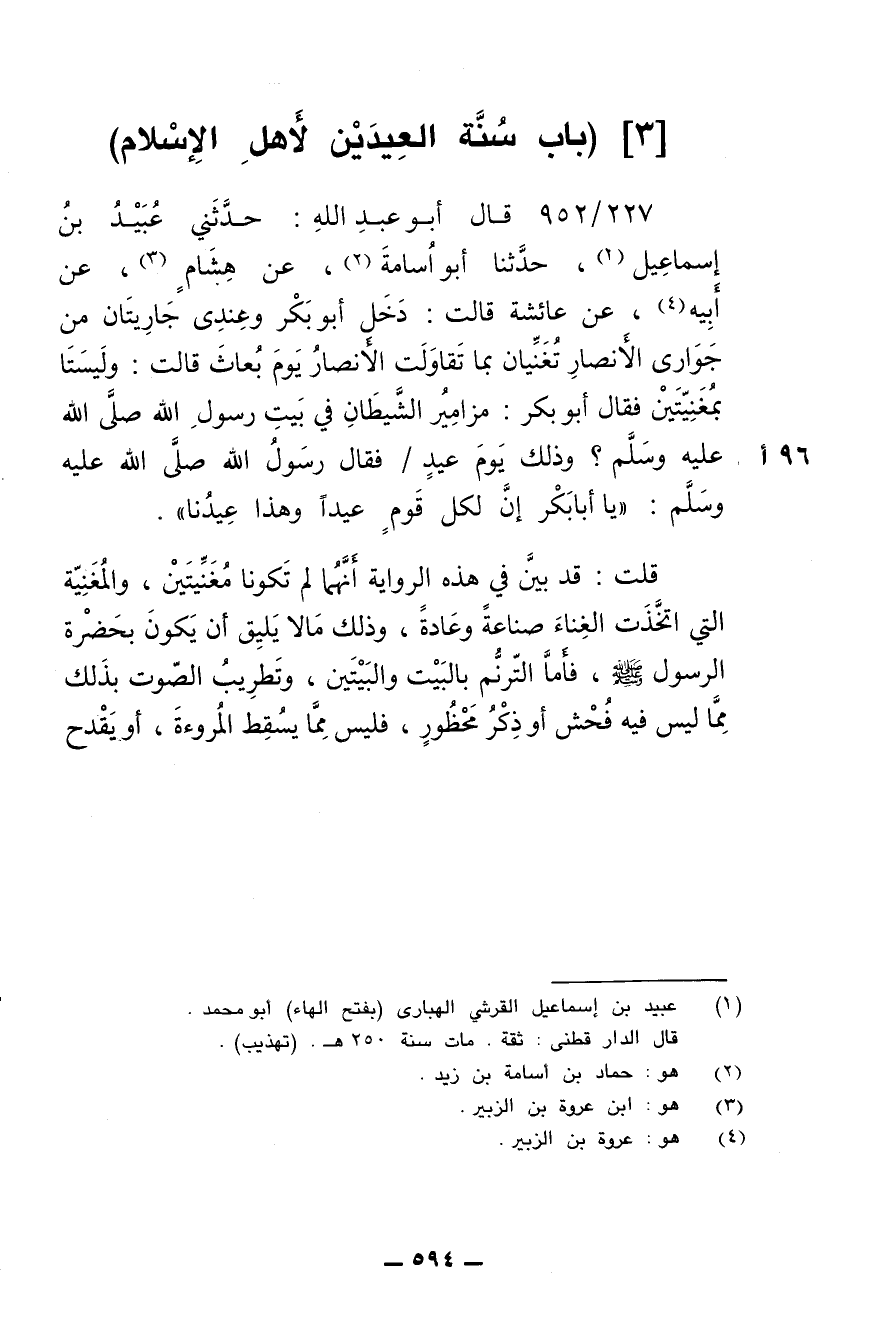 227/ 952 - قال أبو عبد الله: حدثني عبيد بن إسماعيل، حدثنا أبو أسامة، عن هشام، عن أبيه، عن عائشة قالت: دخل أبو بكر وعندي جاريتان من جواري الأنصار تغنيان بما تقاولت الأنصار يوم بعاث قالت: وليستا بمغنيتين فقال أبو بكر: مزامير الشيطان في بيت رسول الله صلى الله عليه وسلم؟ وذلك يوم عيد، فقال رسول الله صلى الله عليه وسلم: (يا أبا بكر إن لكل قوم عيدا وهذا عيدنا).