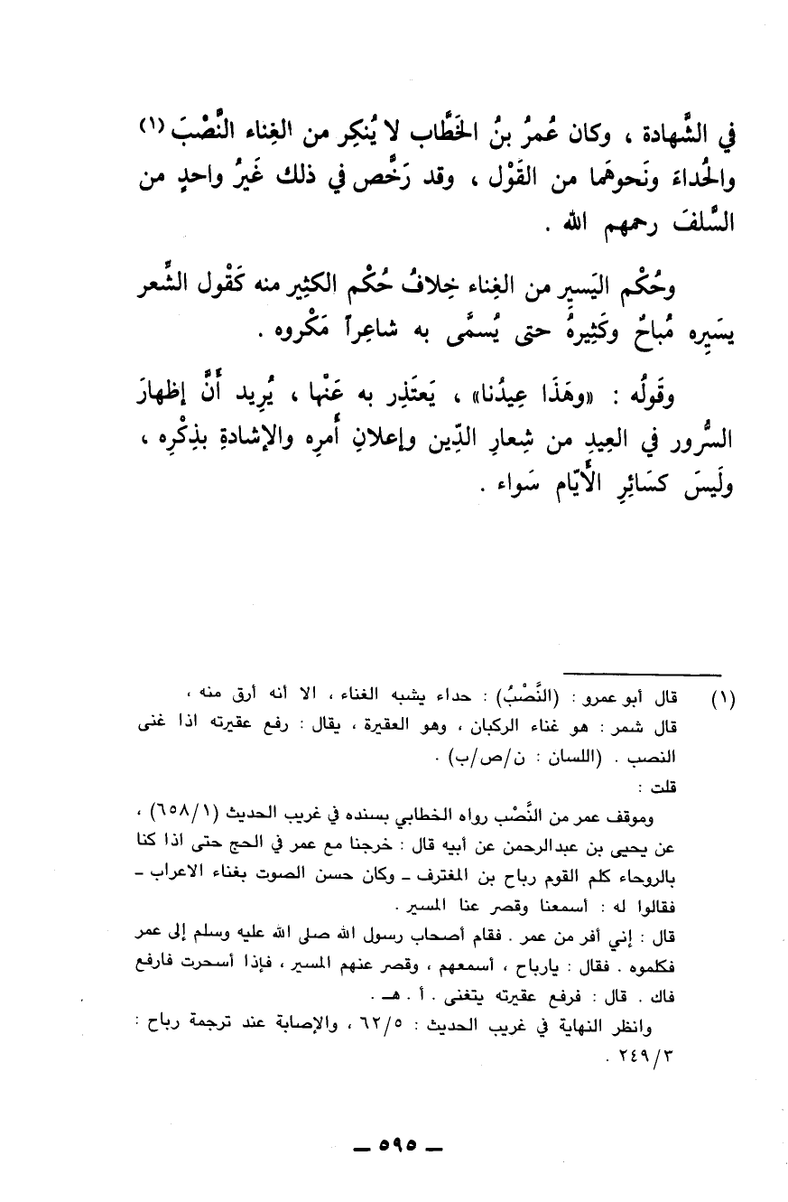 في الشهادة، وكان عمر بن الخطاب لا ينكر من الغناء النَّصْبَ والحداء ونحوهما من القول، وقد رخص في ذلك غيرُ واحد من السلف رحمهم الله.