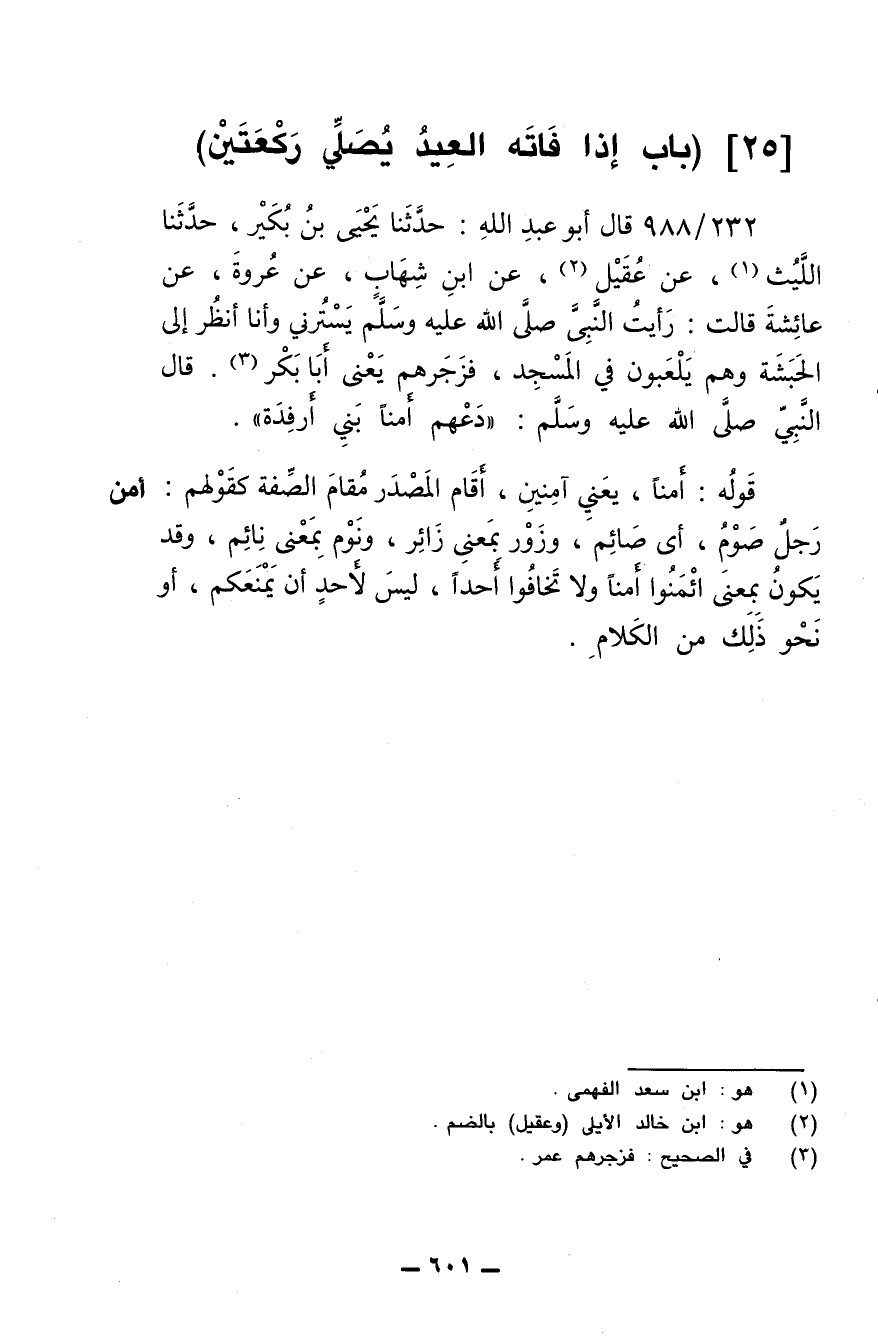 232/ 988 - قال أبو عبد الله: حدثنا يحيى بن بكير، حدثنا الليث، عن عقيل، عن ابن شهاب، عن عروة، عن عائشة قالت: رأيت النبي صلى الله عليه وسلم يسترني وأنا أنظر إلى الحبشة وهم يلعبون في المسجد، فزجرهم يعني أبا بكر. قال النبي صلى الله عليه وسلم: (دعهم أمنًا بني أرفدة).