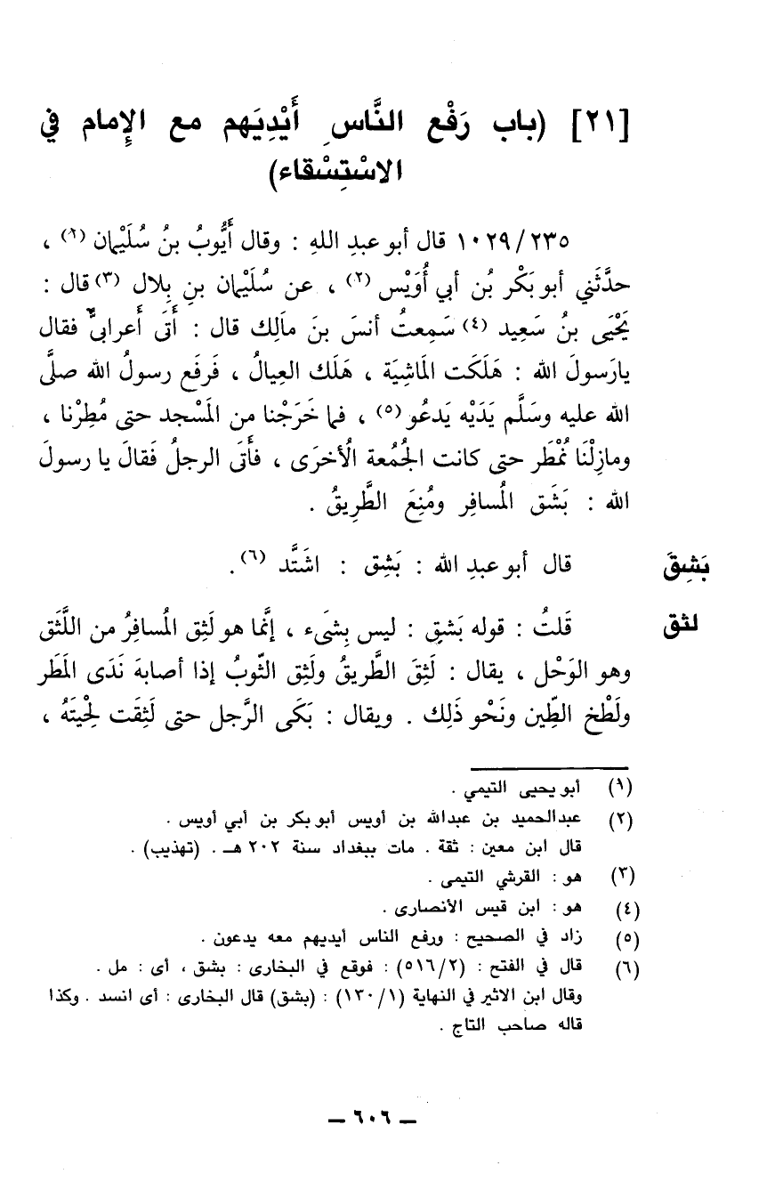 235/ 1029 - قال أبو عبد الله: وقال أيوب بن سليمان: حدثني أبو بكر بن أبي أويس، عن سليمان بن بلال قال: يحيى بن سعيد سمعت أنس بن مالك قال: أتى أعرابي فقال: يا رسول الله، هلكت الماشية، هلك العيال، فرفع رسول الله صلى الله عليه وسلم يديه يدعو، فما خرجنا من المسجد حتى مُطرنا، وما زلنا نُمطَر حتى كانت الجمعة الأخرى، فأتى الرجلُ فقال: يا رسول الله، بَشِق المسافر ومُنع الطريق.