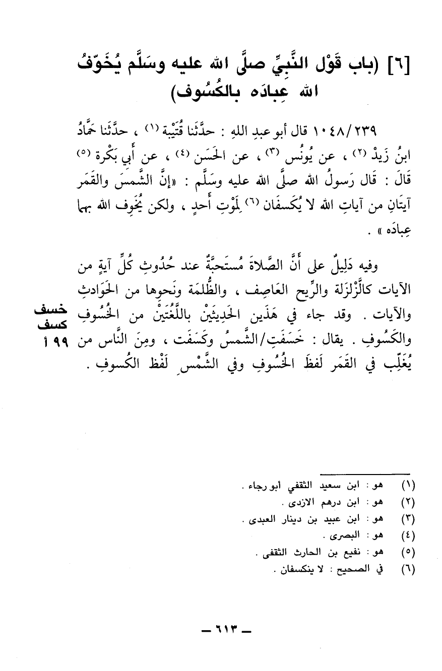 239/ 1048 - قال أبو عبد الله: حدثنا قتيبة، حدثنا حماد بن زيد، عن يونس، عن الحسن، عن أبي بكرة قال: قال رسول الله صلى الله عليه وسلم: (إن الشمس والقمر آيتان من آيات الله لا يُكسفان لموت أحد، ولكن يخوف الله بهما عباده).