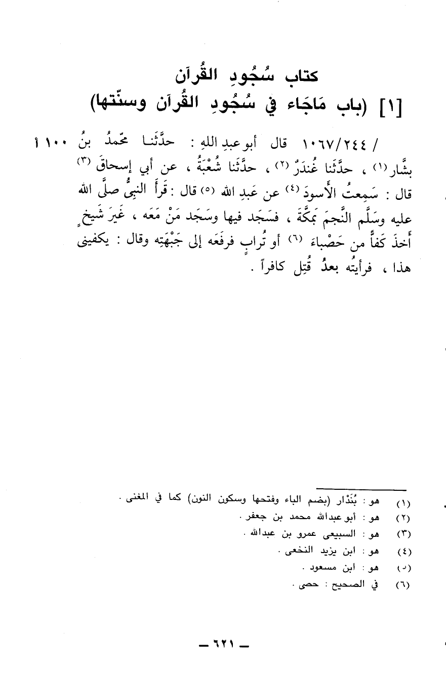 244/ 1067 - قال أبو عبد الله: حدثنا محمد بن بشار، حدثنا غندر، حدثنا شعبة، عن أبي إسحاق قال: سمعت الأسود عن عبد الله قال: قرأ النبي صلى الله عليه وسلم النجم بمكة، فسجد فيها وسجد من معه، غير شيخ أخذ كفا من حصباء أو تراب فرفعه إلى جبهته وقال: يكفيني هذا، فرأيته بعدُ قتل كافرا.