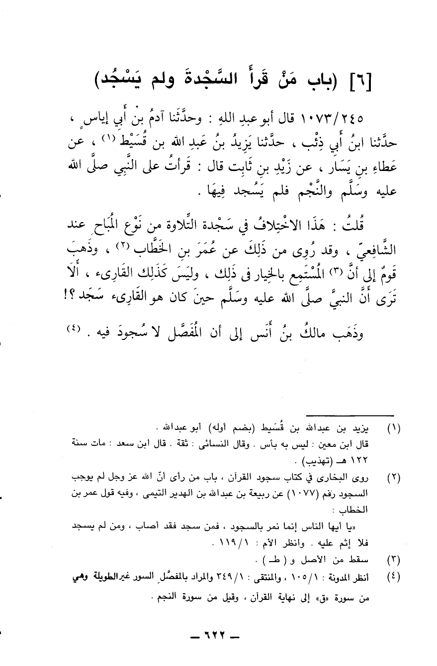245/ 1073 - قال أبو عبد الله: وحدثنا آدم بن أبي إياس، حدثنا ابن أبي ذئب، حدثنا يزيد بن عبد الله بن قسيط، عن عطاء بن يسار، عن زيد بن ثابت قال: قرأت على النبي صلى الله عليه وسلم والنجم فلم يسجد فيها.