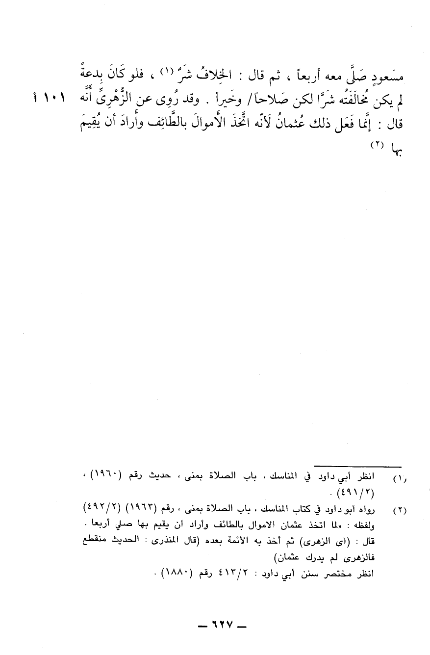 مسعود صلى معه أربعا، ثم قال: الخلاف شر، فلو كان بدعة لم يكن مخالفته شرا لكن صلاحا وخيرا. وقد روي عن الزهري أنه قال: إنما فعل ذلك عثمان لأنه اتخذ الأموال بالطائف وأراد أن يقيم بها.