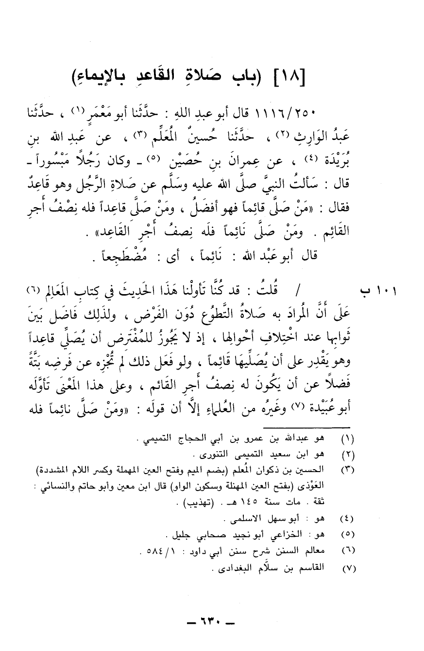 250/ 1116 - قال أبو عبد الله: حدثنا أبو معمر، حدثنا عبد الوارث، حدثنا حسين المعلم، عن عبد الله بن بريدة، عن عمران بن حصين -وكان رجلا مَبْسورا- قال: سألت النبي صلى الله عليه وسلم عن صلاة الرجل وهو قاعد فقال: (من صلى قائما فهو أفضل، ومن صلى قاعدا فله نصف أجر القائم، ومن صلى نائما فله نصف أجر القاعد).