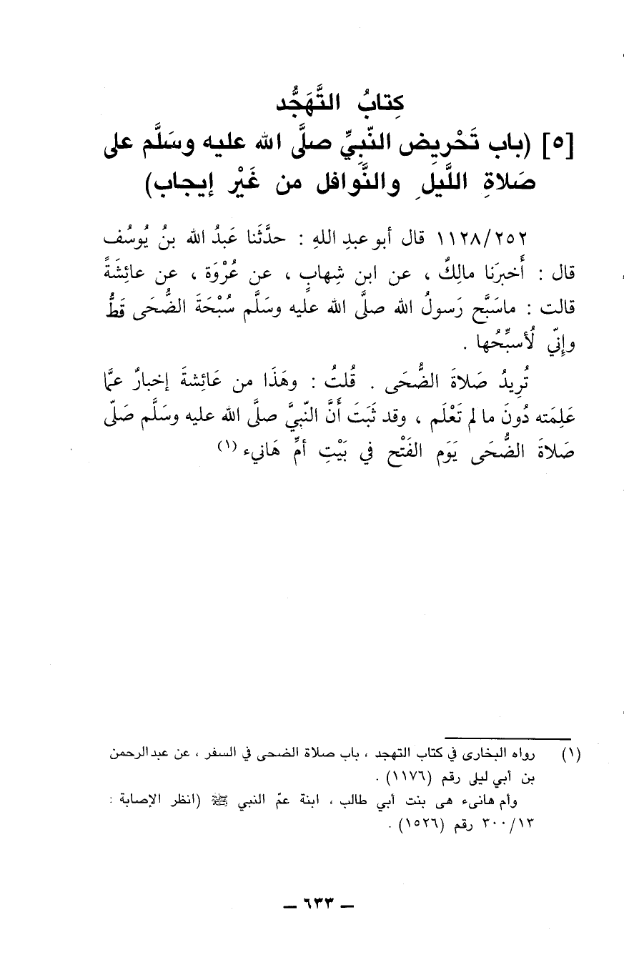 252/ 1128 - قال أبو عبد الله: حدثنا عبد الله بن يوسف قال: أخبرنا مالك، عن ابن شهاب، عن عروة، عن عائشة قالت: ما سبح رسول الله صلى الله عليه وسلم سبحة الضحى قط وإني لأسبحها.