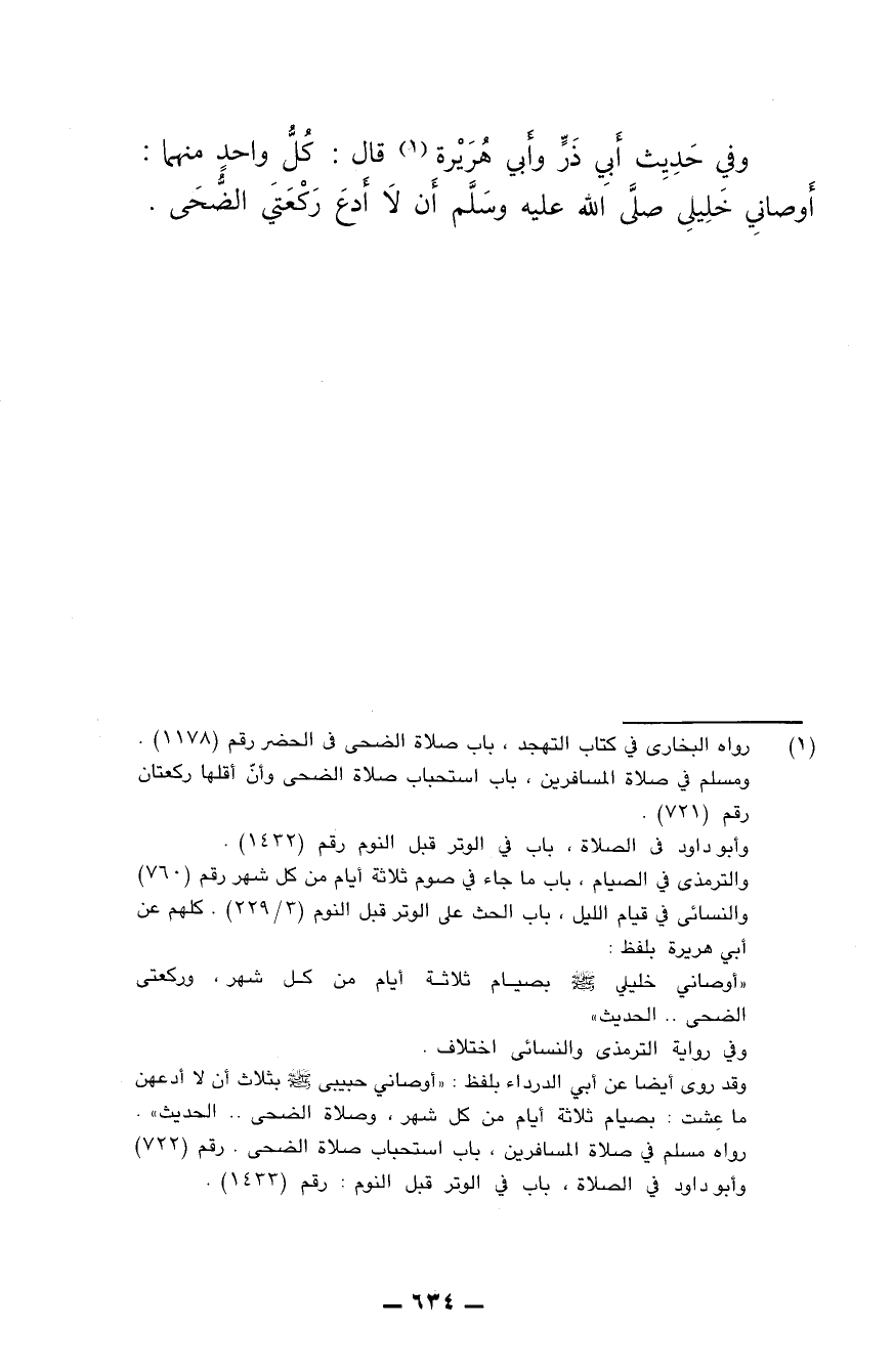 وفي حديث أبي ذر وأبي هريرة قال كل واحد منهما: أوصاني خليلي صلى الله عليه وسلم أن لا أدع ركعتي الضحى.