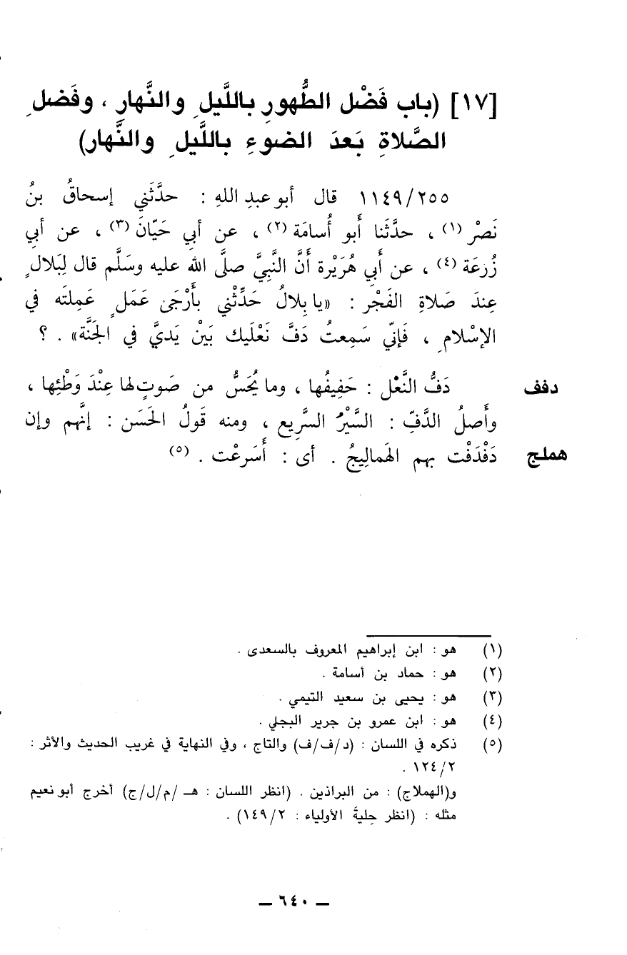 255/ 1149 - قال أبو عبد الله: حدثني إسحاق بن نصر، حدثنا أبو أسامة، عن أبي حيان، عن أبي زرعة، عن أبي هريرة أن النبي صلى الله عليه وسلم قال لبلال عند صلاة الفجر: (يا بلال حدثني بأرجى عمل عملته في الإسلام، فإني سمعت دف نعليك بين يدي في الجنة)؟