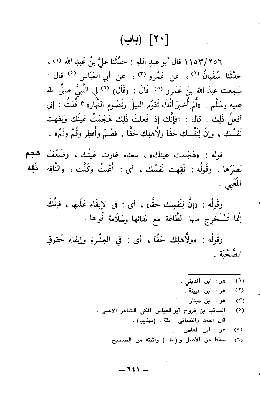 256/ 1153 - قال أبو عبد الله: حدثنا علي بن عبد الله، حدثنا سفيان، عن عمرو، عن أبي العباس قال: سمعت عبد الله بن عمرو قال: (قال) لي النبي صلى الله عليه وسلم: (ألم أخبر أنك تقوم الليل وتصوم النهار)؟ قلت: إني أفعل ذلك. قال: (فإنك إذا فعلت ذلك هجمت عينك ونقهت نفسك، وإن لنفسك حقا ولأهلك حقا، فصم وأفطر وقم ونم).