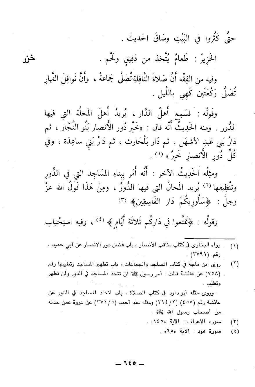 ومثله الحديث الآخر: أنه أمر ببناء المساجد التي في الدور وتنظيفها، يريد المحال التي فيها الدور، ومن هذا قول الله عز وجل: {سأريكم دار الفاسقين}.