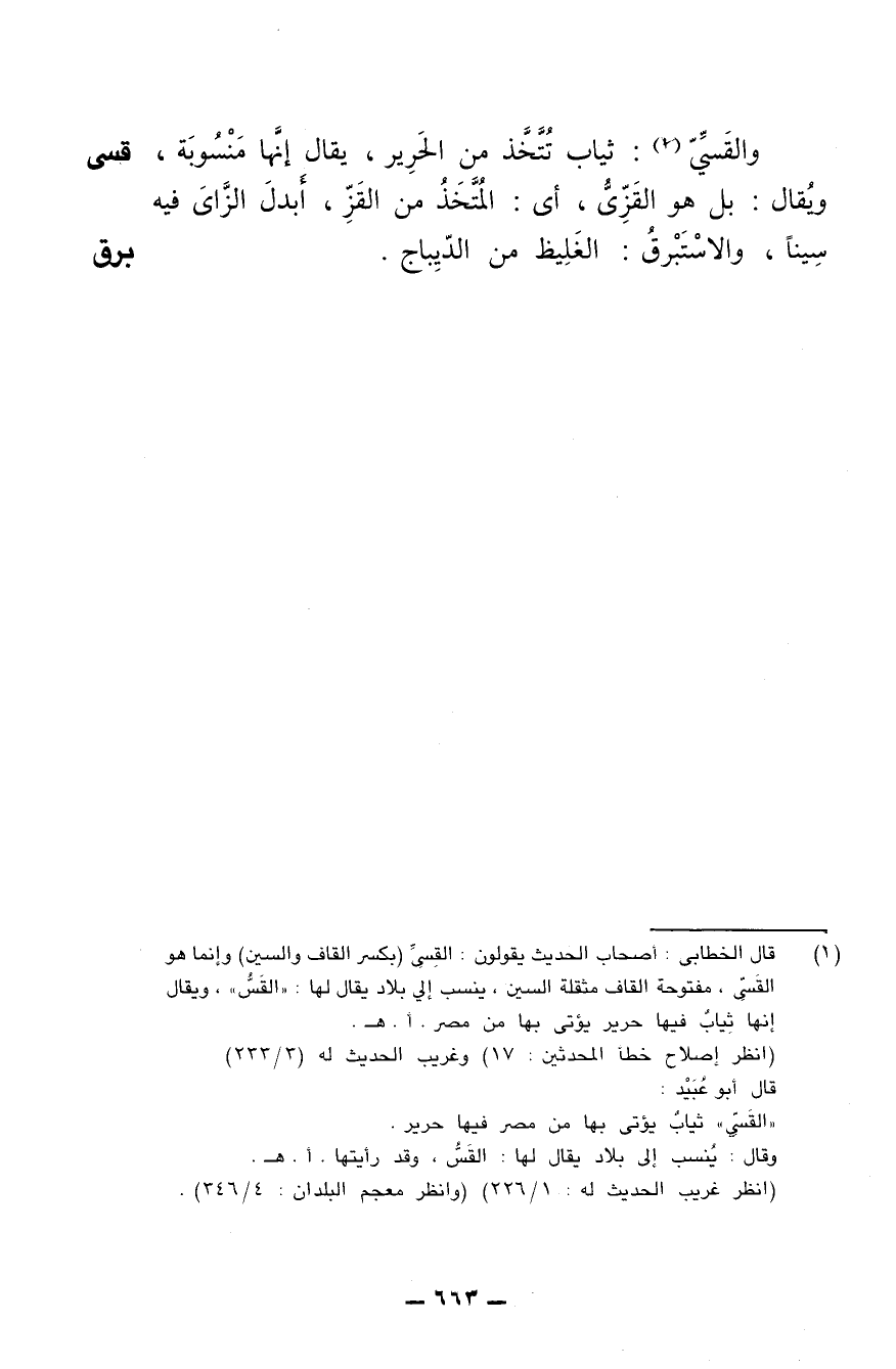 والقسِّي: ثياب تتخذ من الحرير، يقال: إنها منسوبة، ويقال: بل هو القزِّي، أي المتخذ من القز، أبدل الزاي فيه سينا، والإستبرق: الغليظ من الديباج.