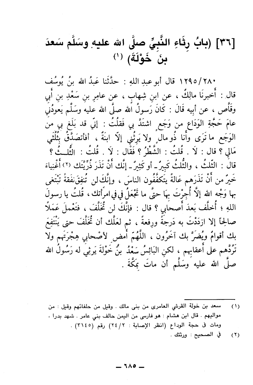 280/ 1290 - قال أبو عبد الله: حدثنا عبد الله بن يوسف قال: أخبرنا مالك، عن ابن شهاب، عن عامر بن سعد بن أبي وقاص، عن أبيه قال: كان رسول الله صلى الله عليه وسلم يعودني عام حجة الوداع من وجع اشتد بي، فقلت: إني قد بلغ بي من الوجع ما ترى وأنا ذو مال، ولا يرثني إلا ابنة، أفأتصدق بثلثي مالي؟ قال: لا، قلت: الشطر؟ فقال: لا، قلت: الثلث؟ قال: الثلث، والثلث كبير -أو كثير- إنك أن تذر ذريتك أغنياء خير من أن تذرهم عالة يتكففون الناس، وإنك لن تنفق نفقة تبتغي بها وجه الله إلا أجرت بها حتى ما تجعل في في امرأتك، قلت: يا رسول الله؛ أخلف بعد أصحابي؟ قال: فإنك لن تخلف فتعمل عملا صالحا إلا ازددت به درجة ورفعة، ثم لعلك أن تخلف حتى ينتفع بك أقوام ويضر بك آخرون، اللهم أمض لأصحابي هجرتهم ولا تردهم على أعقابهم، لكن البائس سعد بن خولة، يرثي له رسول الله صلى الله عليه وسلم أن مات بمكة.
