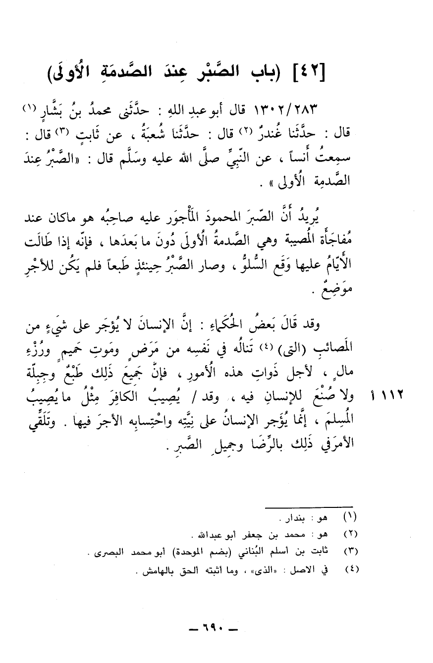 283/ 1302 - قال أبو عبد الله: حدثني محمد بن بشار قال: حدثنا غندر قال: حدثنا شعبة، عن ثابت قال: سمعت أنسا، عن النبي صلى الله عليه وسلم قال: (الصبر عند الصدمة الأولى).