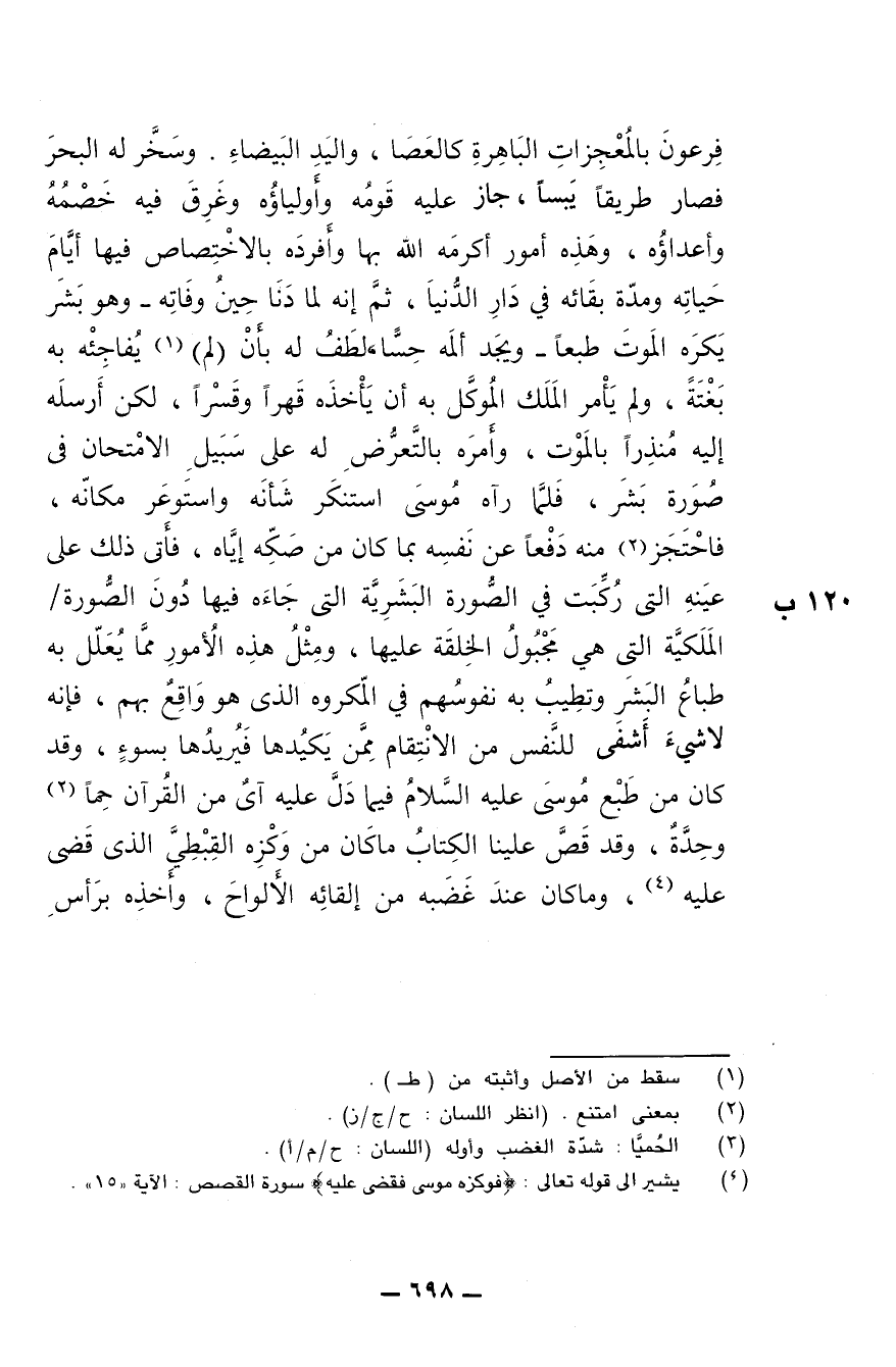 فرعون بالمعجزات الباهرة كالعصا، واليد البيضاء، وسخر له البحر فصار طريقا يبسا، جاز عليه قومُه وأولياؤه وغرق فيه خصمه وأعداؤه، وهذه أمور أكرمه الله بها وأفرده بالاختصاص فيها أيام حياته ومدة بقائه في دار الدنيا، ثم إنه لما دنا حين وفاته -وهو بشر يكره الموت طبعا ويجد ألمه حسا- لطف له بأن (لم) يفاجئه به بغتة، ولم يأمر الملك الموكل به أن يأخذه قهرا وقسرا، لكن أرسله إليه منذرا بالموت، وأمره بالتعرض له على سبيل الامتحان في صورة بشر، فلما رآه موسى استنكر شأنه واستوعر مكانه، فاحتجز منه دفعا عن نفسه بما كان من صكه إياه، فأتى ذلك على عينه التي ركبت في الصورة البشرية التي جاء فيها دون الصورة الملكية التي هي مجبول الخلقة عليها، ومثل هذه الأمور مما يعلل به طباع البشر وتطيب به نفوسهم في المكروه الذي هو واقع بهم، فإنه لا شيء أشفى للنفس من الانتقام ممن يكيدها فيريدها بسوء، وقد كان من طبع موسى عليه السلام فيما دل عليه آي من القرآن حما [؟] وحدة، وقد قص علينا الكتاب ما كان من وكزه القبطي الذي قضى عليه، وما كان عند غضبه من إلقائه الألواح، وأخذه برأس