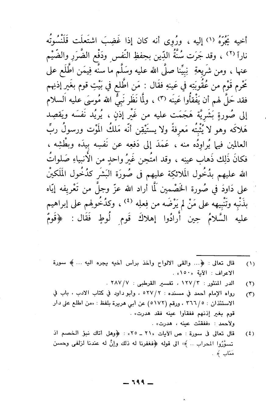أخيه يجره إليه، وروي أنه كان إذا غضب اشتعلت قلنسوته نارا، وقد جرت سنة الدين بحفظ النفس، ودفع الضرر والضيم عنها، ومن شريعة نبينا صلى الله عليه وسلم ما سنه فيمن اطلع على محرم قوم من عقوبته في عينه فقال: من اطلع في بيت قوم بغير إذنهم فقد حل لهم أن يفقأوا عينه، ولما نظر نبي الله موسى عليه السلام إلى صورة بشرية هجمت عليه من غير إذن، يريد نفسه ويقصد هلاكه وهو لا يثبته معرفة ولا يستيقن أنه ملك الموت ورسولُ رب العالمين فيما يراوده منه، عمَد إلى دفعه عن نفسه بيده وبطشه، فكان ذلك ذهاب عينه، وقد امتُحن غيرُ واحد من الأنبياء صلوات الله عليهم بدخول الملائكة عليهم في صورة البشر كدخول الملكين على داود في صورة الخصمين؛ لِمَا أراد الله عز وجل من تعريفه إياه بذنبه وتنبيهه على من لم يرضه من فعله، وكدخولهم على إبراهيم عليه السلام حين أرادوا إهلاك قوم لوط، فقال: {قوم