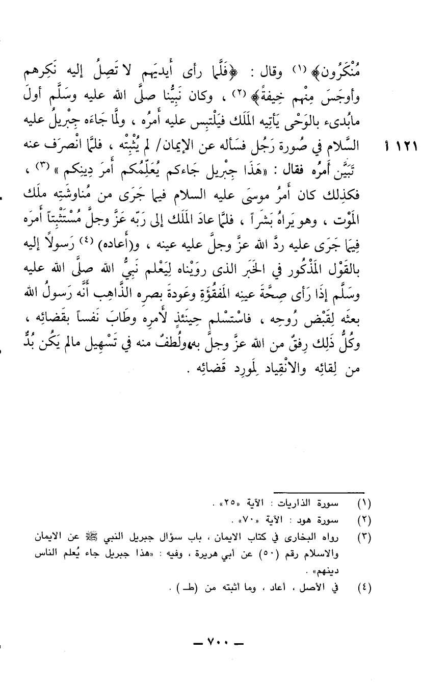 منكرون}، وقال: {فلما رأى أيديهم لا تصل إليه نكرهم وأوجس منهم خيفة}، وكان نبينا صلى الله عليه وسلم أول ما بدئ بالوحي يأتيه الملك فيلتبس عليه أمره، ولما جاءه جبريل عليه السلام في صورة رجل فسأله عن الإيمان لم يثبته، فلما انصرف عنه تبين أمرُه فقال: (هذا جبريل جاءكم يعلمكم أمر دينكم)، فكذلك كان أمر موسى عليه السلام فيما جرى من مناوشته ملك الموت، وهو يراه بشرا، فلما عاد الملك إلى ربه عز وجل مستثبتا أمره فيما جرى عليه رد الله عز وجل عليه عينه، و (أعاده) رسولا إليه بالقول المذكور في الخبر الذي رويناه ليعلم نبي الله صلى الله عليه وسلم إذا رأى صحة عينه المفقوءة وعودة بصره الذاهب أنه رسول الله بعثه لقبض روحه، فاستسلم حينئذ لأمره وطاب نفسا بقضائه، وكل ذلك رفق من الله عز وجل به، ولطف منه في تسهيل ما لم يكن بد من لقائه والانقياد لمورد قضائه.