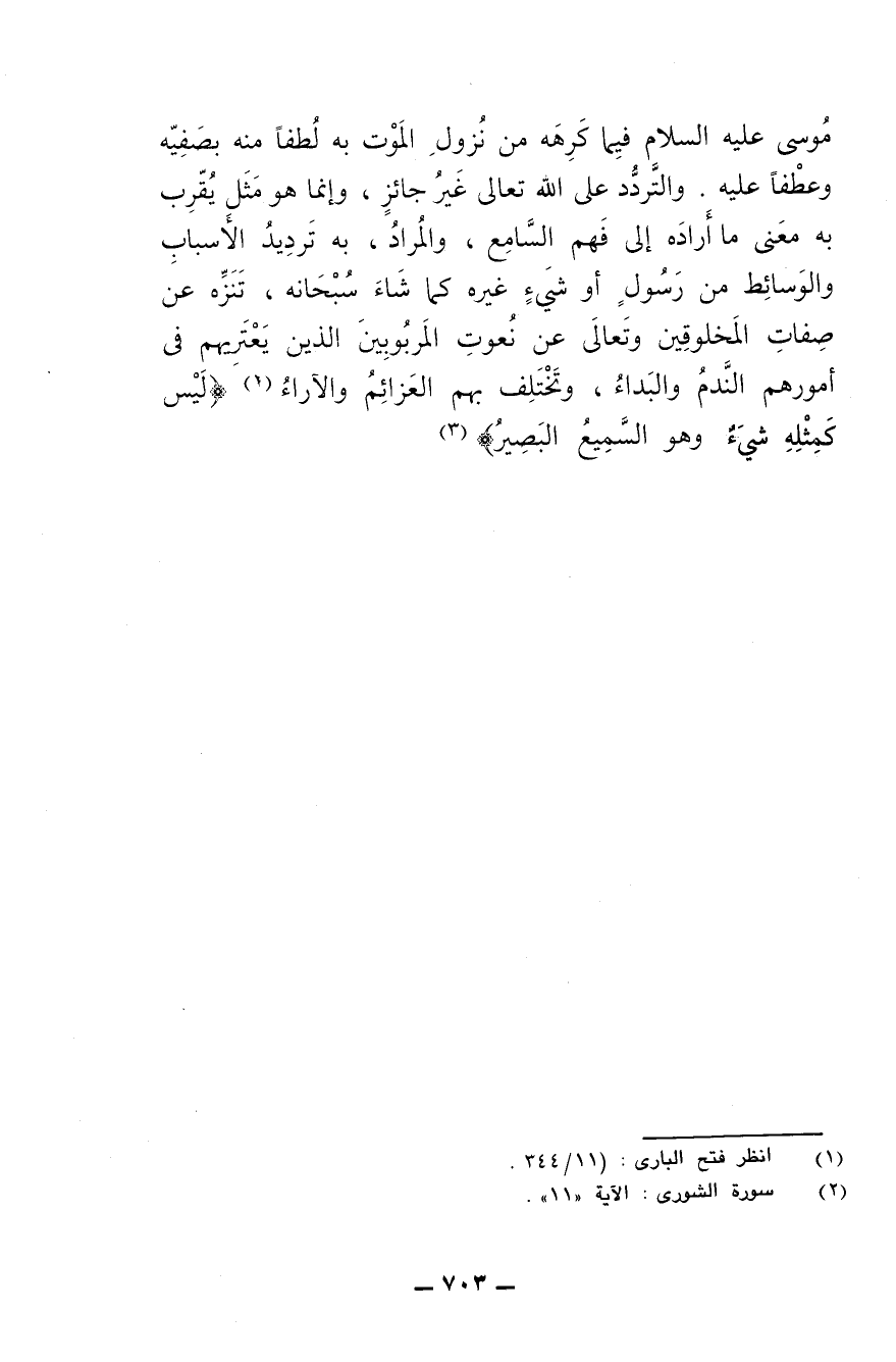 موسى عليه السلام فيما كرهه من نزول الموت به لطفا منه بصفيِّه وعطفا عليه. والتردد على الله تعالى غيرُ جائز، وإنما هو مثل يُقرِّب به معنى ما أراده إلى فهم السامع، والمراد به ترديد الأسباب والوسائط من رسول أو شيء غيره كما شاء سبحانه، تنزه عن صفات المخلوقين وتعالى عن نعوت المربوبين الذين يعتريهم في أمورهم الندم والبداء، وتختلف بهم العزائم والآراء {ليس كمثله شيء وهو السميع البصير}.