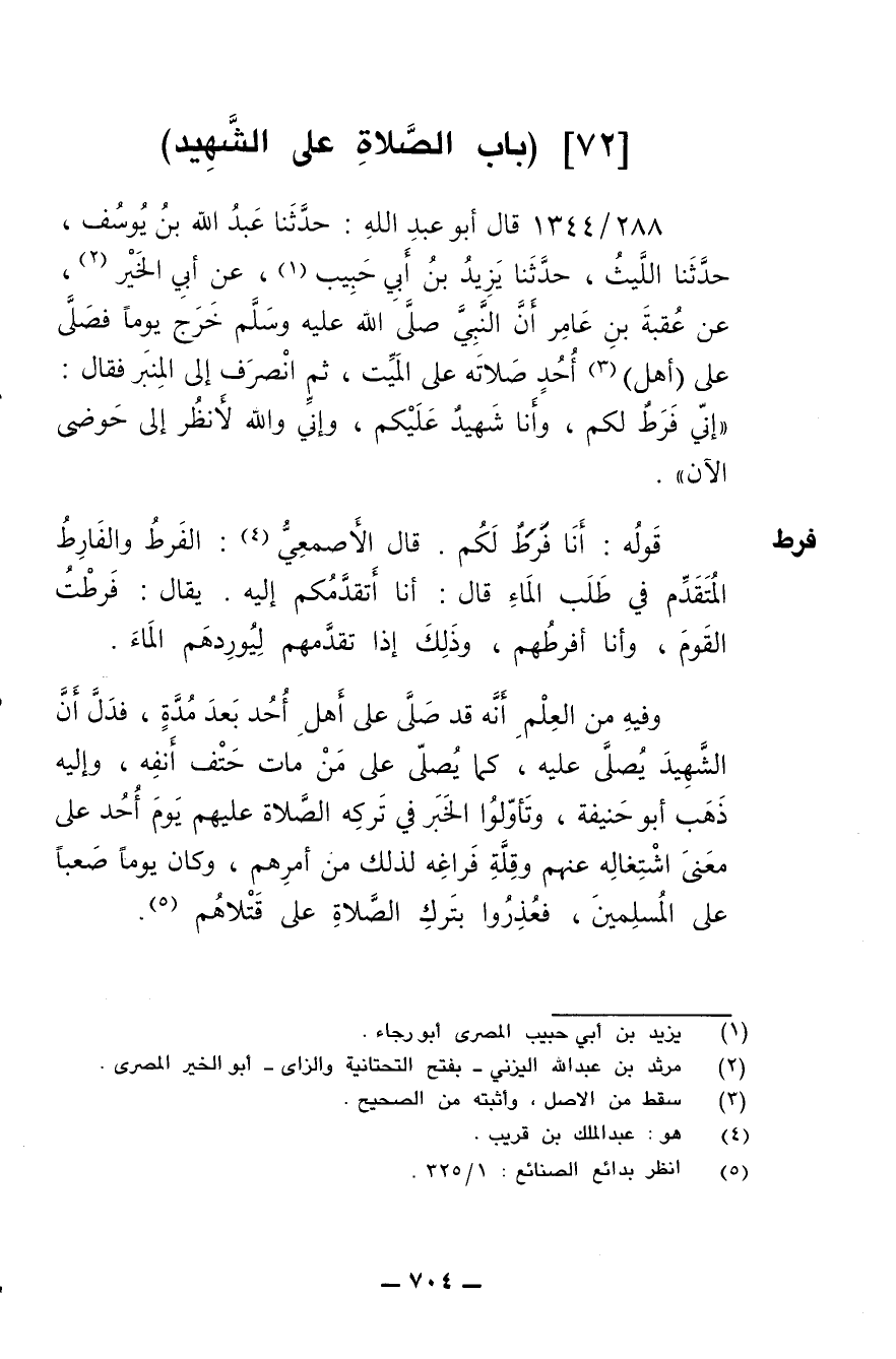 288/ 1344 - قال أبو عبد الله: حدثنا عبد الله بن يوسف، حدثنا الليث، حدثنا يزيد بن أبي حبيب، عن أبي الخير، عن عقبة بن عامر أن النبي صلى الله عليه وسلم خرج يوما فصلى على (أهل) أحد صلاته على الميت، ثم انصرف إلى المنبر فقال: (إني فرط لكم، وأنا شهيد عليكم، وإني والله لأنظر إلى حوضي الآن).