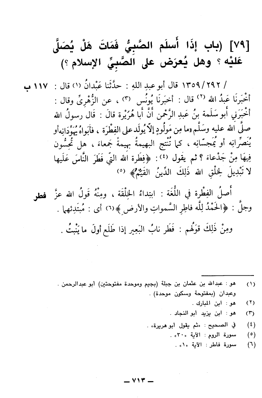 292/ 1359 - قال أبو عبد الله: حدثنا عبدان قال: أخبرنا عبد الله، قال: أخبرنا يونس، عن الزهري وقال [قال]: أخبرني أبو سلمة بن عبد الرحمن أن أبا هريرة قال: قال رسول الله صلى الله عليه وسلم (ما من مولود إلا يولد على الفطرة، فأبواه يهودانه أو ينصرانه أو يمجسانه، كما تنتج البهيمة بهيمة جمعاء، هل تحسون فيها من جدعا؟ ثم يقول: {فطرة الله التي فطر الناس عليها لا تبديل لخلق الله ذلك الدين القيم}).