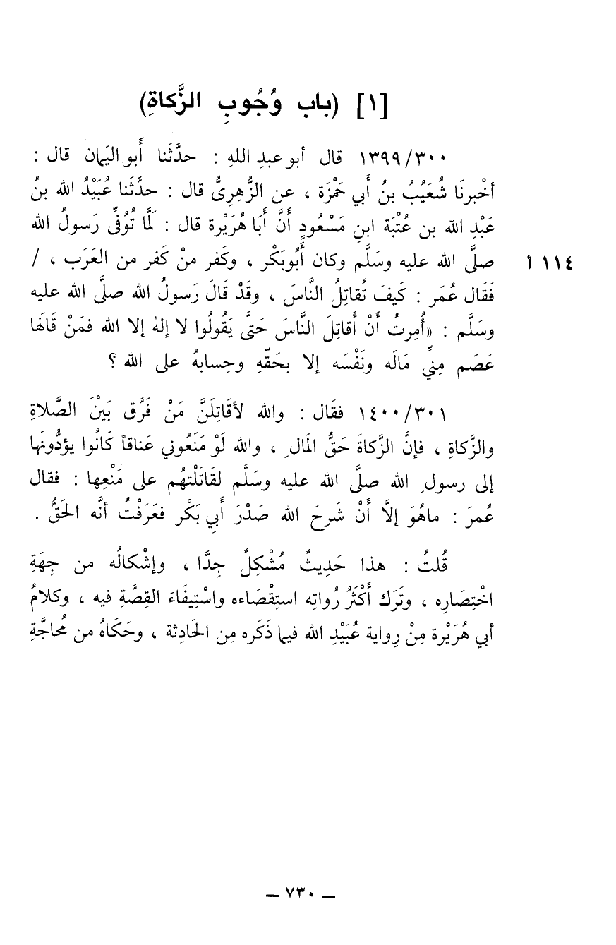 300/ 1399 - قال أبو عبد الله: حدثنا أبو اليمان قال: أخبرنا شعيب بن أبي حمزة، عن الزهري قال: حدثنا عبيد الله بن عبد الله بن عتبة بن مسعود أن أبا هريرة قال: لما توفي رسول الله صلى الله عليه وسلم وكان أبو بكر، وكفر من كفر من العرب، فقال عمر: كيف تقاتل الناس، وقد قال رسول الله صلى الله عليه وسلم: (أمرت أن أقاتل الناس حتى يقولوا لا إله إلا الله، فمن قالها عصم مني ماله ونفسه إلا بحقه وحسابه على الله)؟