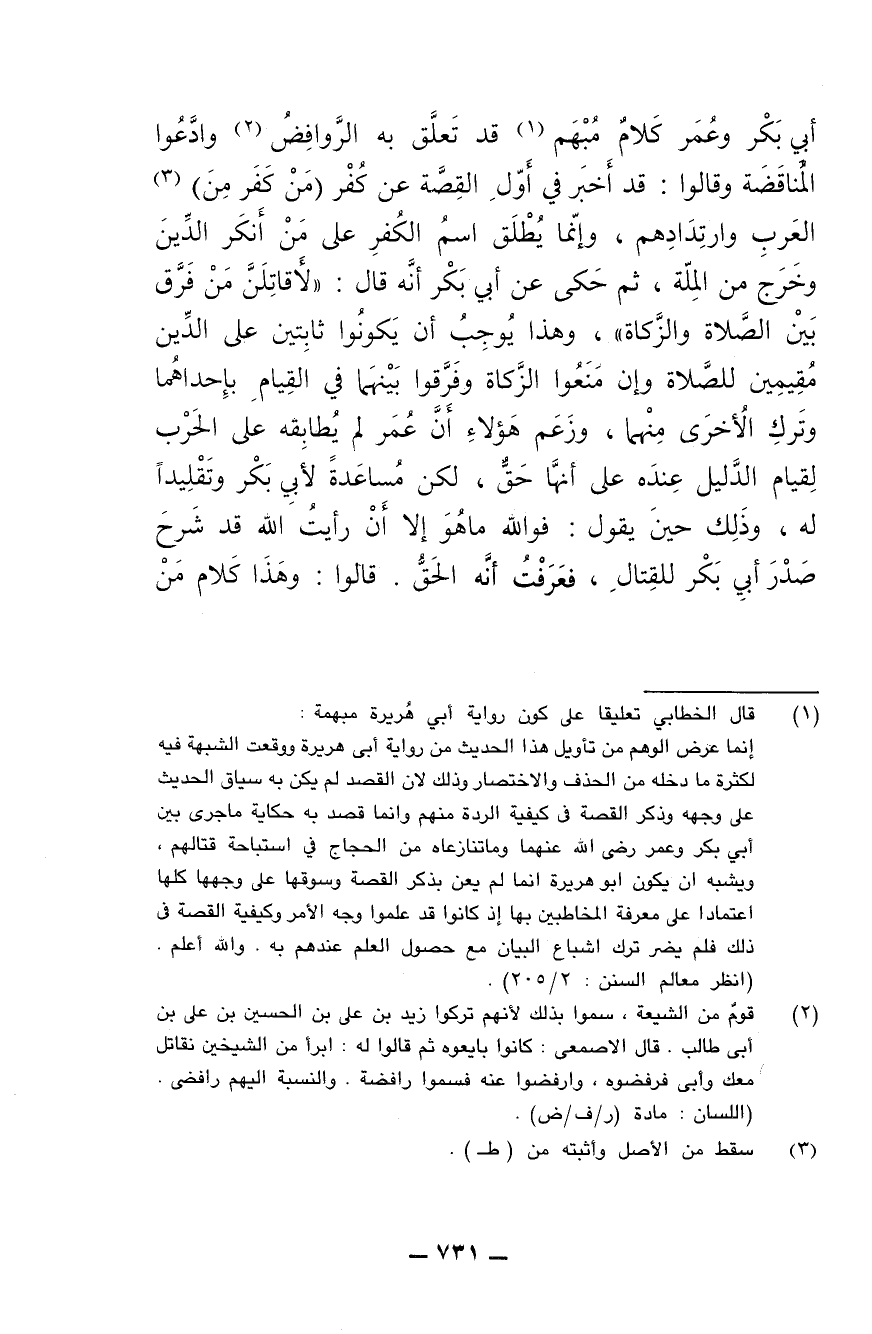 أبي بكر وعمر كلام مبهم قد تعلق به الروافض، وادعوا المناقضة وقالوا: قد أخبر في أول القصة عن كفر (من كفر من) العرب وارتدادهم، وإنما يطلق اسم الكفر على من أنكر الدين وخرج من الملة، ثم حكى عن أبي بكر أنه قال: (لأقاتلن من فرق بين الصلاة والزكاة)، وهذا يوجب أن يكونوا ثابتين على الدين مقيمين للصلاة وإن منعوا الزكاة وفرقوا بينهما في القيام بإحداهما وترك الأخرى منهما، وزعم هؤلاء أن عمر لم يطابقه على الحرب لقيام الدليل عنده على أنها حق، لكن مساعدة لأبي بكر وتقليدا له، وذلك حين يقول: فوالله ما هو إلا أن رأيت الله قد شرح صدر أبي بكر للقتال، فعرفت أنه الحق. قالوا: وهذا كلام من