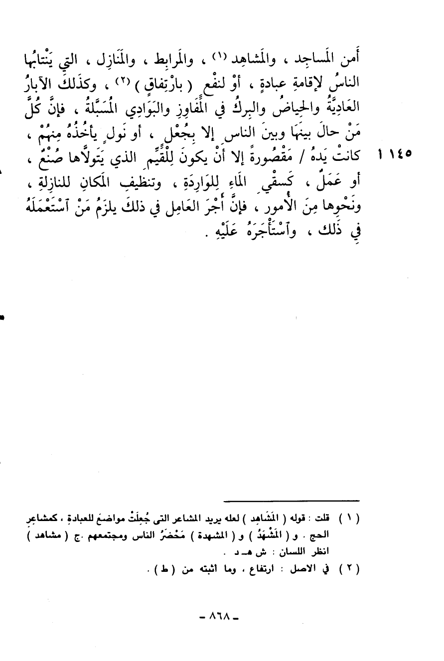 أمن المساجد، والمشاهد، والمرابط، والمنازل، التي ينتابُها النّاس لإقَامةِ العبَادةِ، أو لنفعٍ (بارتِفاقٍ)، وكذلك الآبار العاديّة والحياض والبرك في المفاوز والبَوادي المسَبّلةُ، فإنَّ كل من حال بينها وبين الناس إلا بِجُعْلٍ، أو نَولٍ يأخُّذه منهم، كانت يَدُهُ / مقصُورةُ إلا أن يكونَ للقيَّم الذي يتَولاها صُنعٌ، أو عَملٌ، كَسَقي الماء للوارِدةِ، وتنظيفِ المَكانِ للنَّازلةِ، ونَحوها من الأمورِ، فإنَّ أجر العاملِ في ذلكَ يلزمُ من استَعملهُ في ذلك، واستَأجرهُ عليهِ.