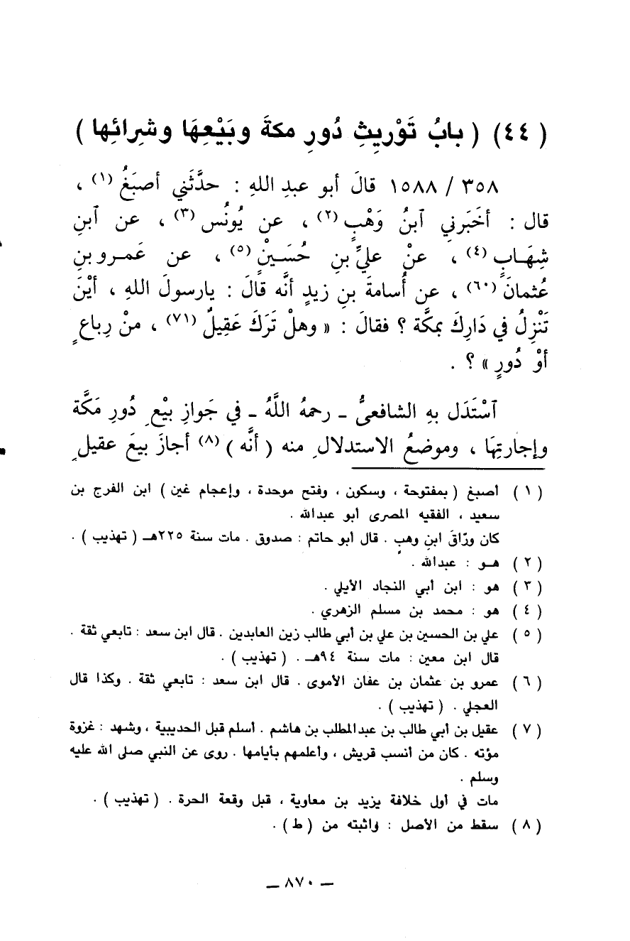 358/ 1588 - قالَ ألو عبدِ الله: حدَّثني أصبغُ، قالَ: أخبرني ابنُ وهب، عن يونس، عن ابنِ شِهابٍ، عن علي بنِ حُسينٍ، عن عمرو بنِ عثمان، عن أُسامةَ بن زيدٍ أنّه قالَ: يا رَسولَ الله، أينَ تنزِلُ في دَاركَ بمكَّة؟ فقالَ: " وهل تَرك عَقيلً، من رِباعٍ أو دُورٍ "