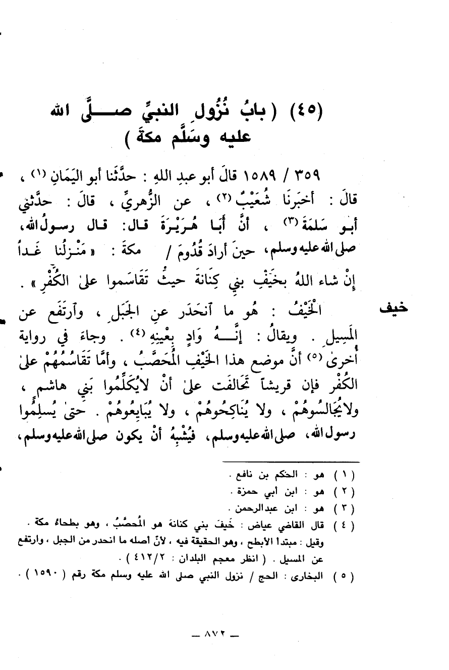 359/ 1589 - قالَ أبو عبدِ الله: حدّثنا أبو اليمان، قالَ أخبرنا شُعيب، عن الزُّهري، قالَ: حدّثني أبو سلمَة، أنّض أبا هريرة قال: قال رسولُ الله، صلى الله عليه وسلم، حينَ أرادَ قُدوم /مكة: " منزِلنا غداً إن شاء الله بخيفِ بني كشنانة حيثُ تَقاسموا على الكُفر ".