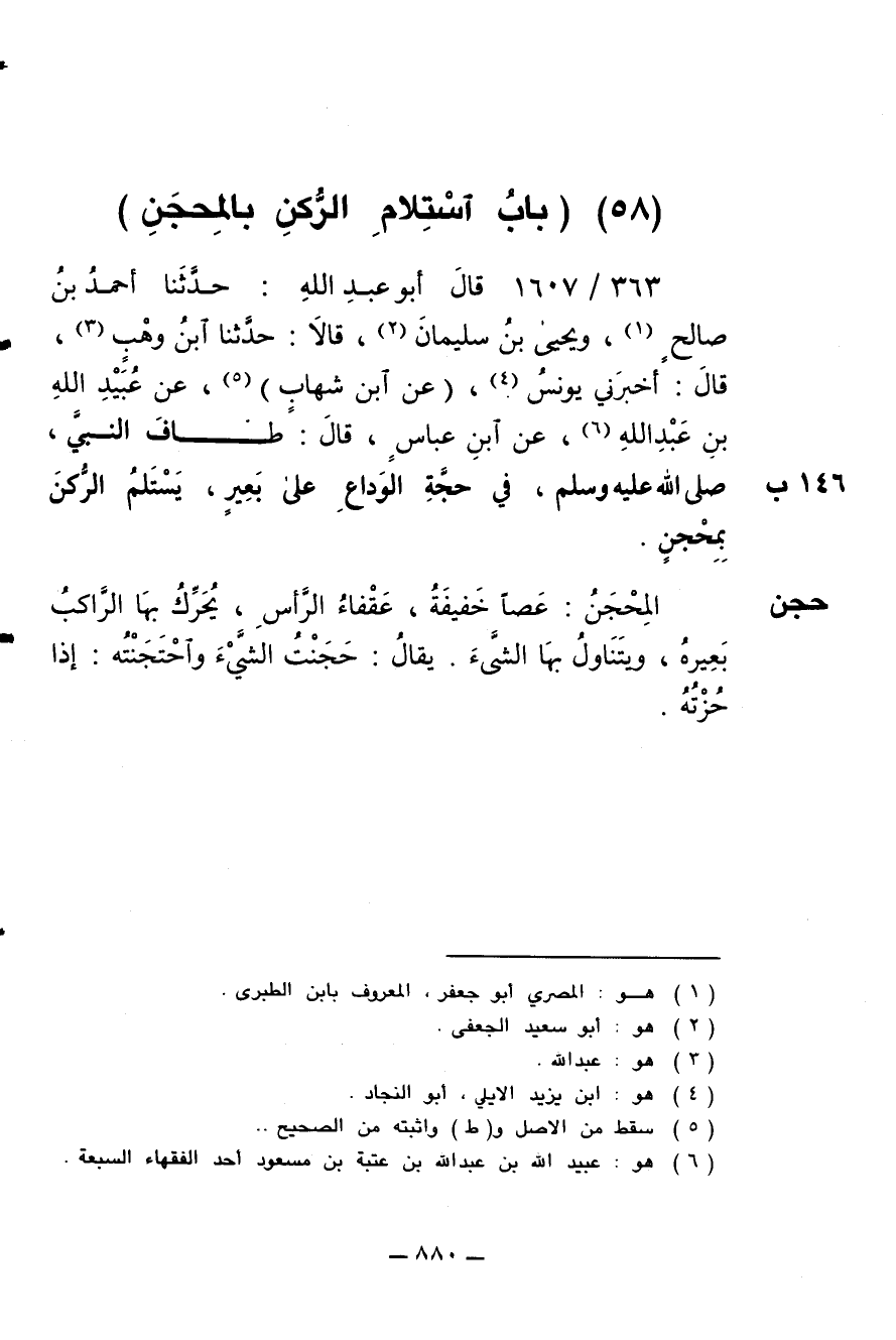 363/ 1607 - قال أبو عبد الله: حدثنا أحمد بن صالح، ويحيى بن سليمان، قالا: حدثنا ابن وهب قال: أخبرني يونس، (عن ابن شهاب)، عن عبيد الله بن عبد الله، عن ابن عباس، قال: طاف النبي صلى الله عليه وسلم، في حجة الوداع على بعير، يستلم الركن بمحجن.