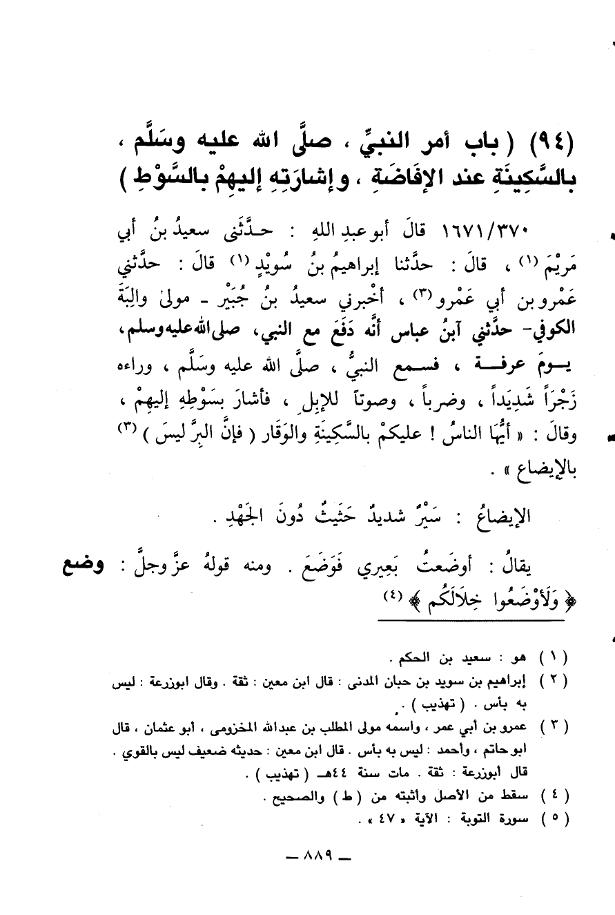 370/ 1671 - قال أبو عبد الله: حدثني سعيد بن أبي مريم، قال: حدثنا إبراهيم بن سويد، قال: حدثني عمرو بن أبي عمرو، أخبرني سعيد بن جبير -مولى والبة الكوفي- حدثني ابن عباس أنه دفع مع النبي صلى الله عليه وسلم يوم عرفة، فسمع النبي صلى الله عليه وسلم وراءه زجرا شديدا، وضربا، وصوتا للإبل، فأشار بسوطه إليهم، وقال: "أيها الناس عليكم بالسكينة والوقار (فإن البر ليس) بالإيضاع".