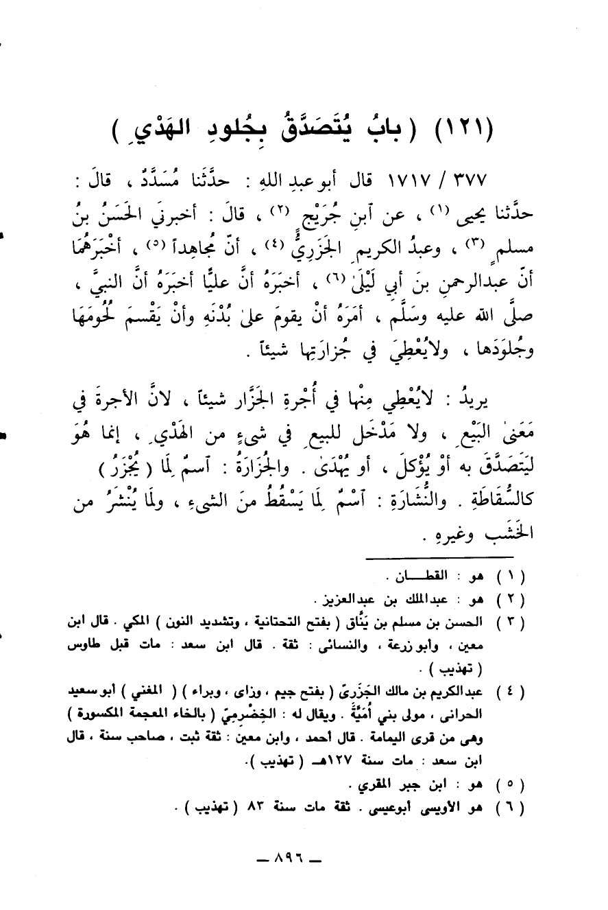 377/ 1717 - قال أبو عبد الله: حدثنا مسدد، قال: حدثنا يحيى، عن ابن جريج، قال: أخبرني الحسن بن مسلم، وعبد الكريم الجزري، أن مجاهدا أخبرهما أن عبد الرحمن بن أبي ليلى أخبره أن عليا أخبره أن النبي صلى الله عليه وسلم أمره أن يقوم على بُدنِه وأن يقسم لحومها وجلودها ولا يعطي في جزارتها شيئا.