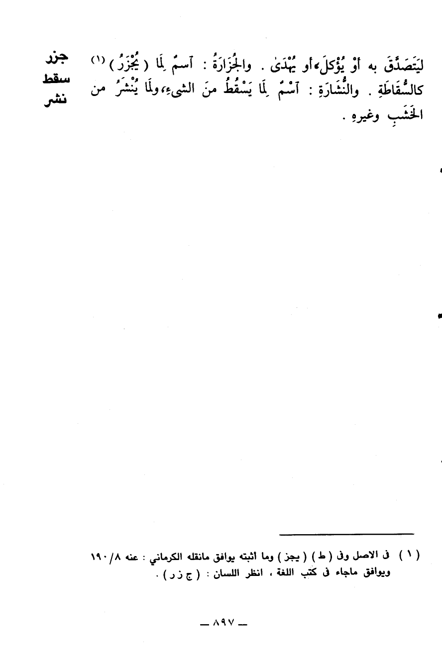 ليتصدق به أو يؤكل أو يهدى. والجزارة: اسم لما (يجزر) كالسقاطة والنشارة: اسم لما يسقط من الشيء ولما ينشر من الخشب وغيره.